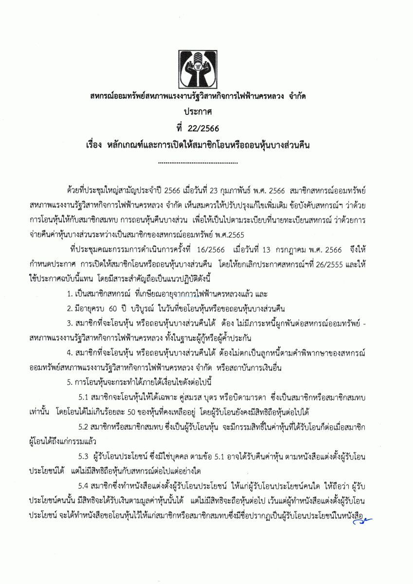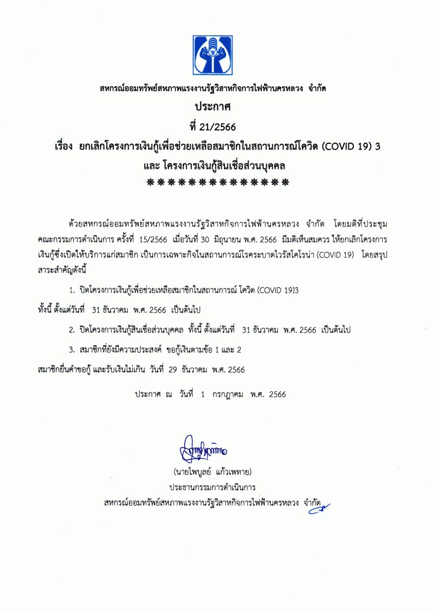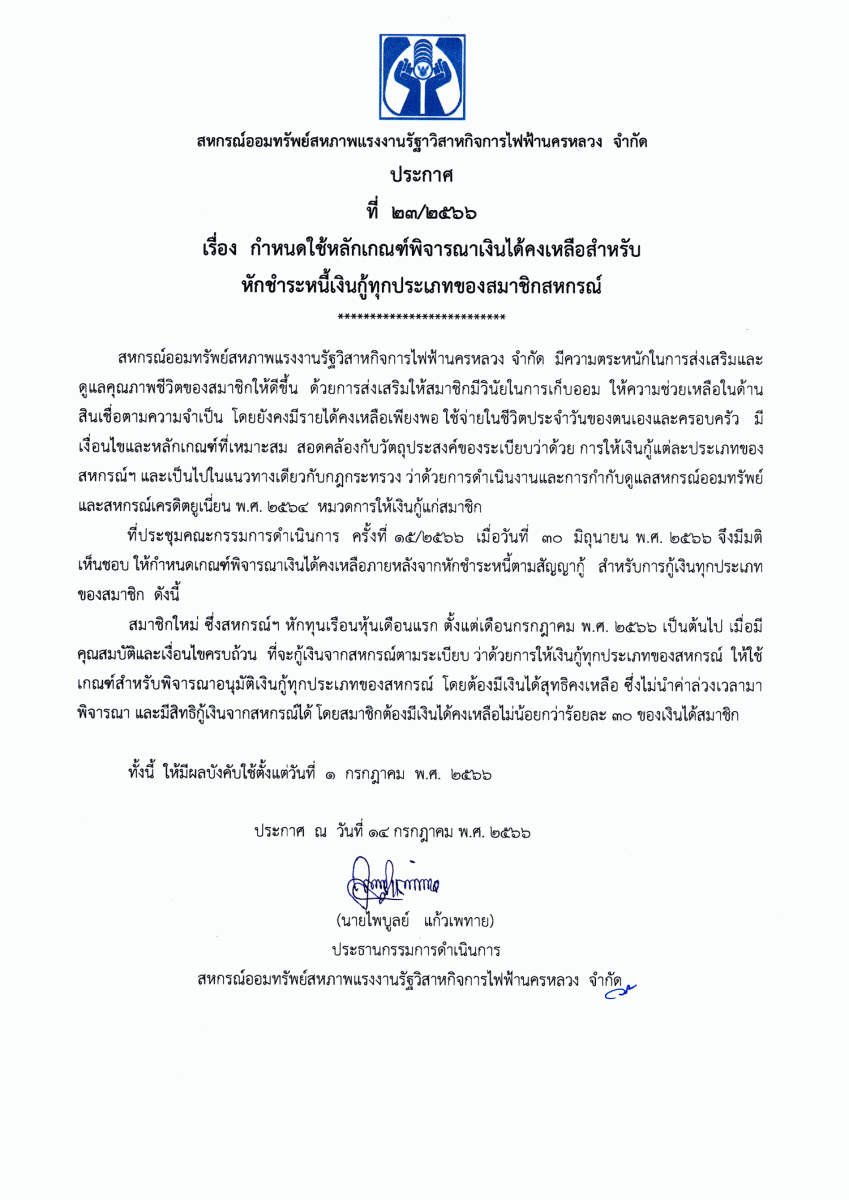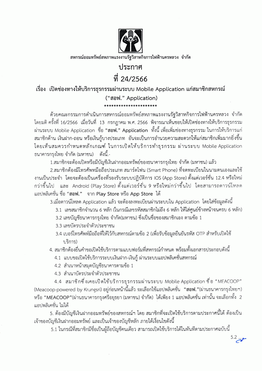 ประกาศที่ 24/2566 เรื่อง เปิดช่องทางให้บริการธุรกรรมผ่านระบบ Mobile Application แก่สมาชิกสหกรณ์ ("สอฟ." Applacation)