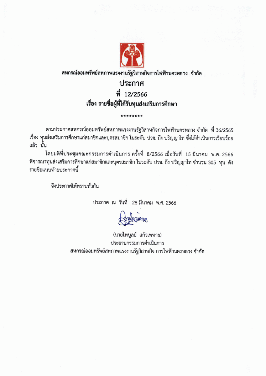 ประกาศที่ 12/2566 เรื่อง รายชื่อผู้ที่ได้รับทุนส่งเสริมการศึกษา
