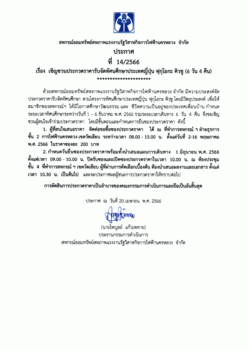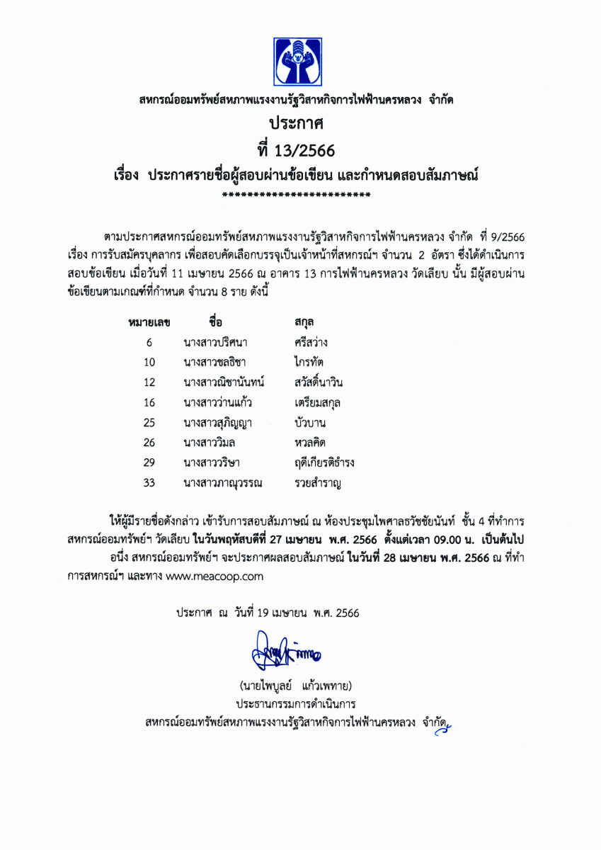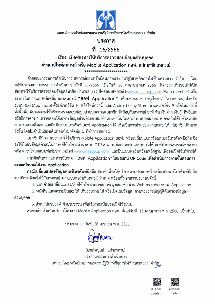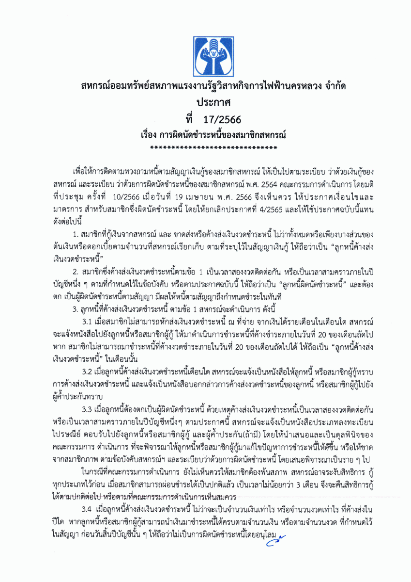 ประกาศที่ 11/2566 โครงการเงินกู้สินเชื่อส่วนบุคคล