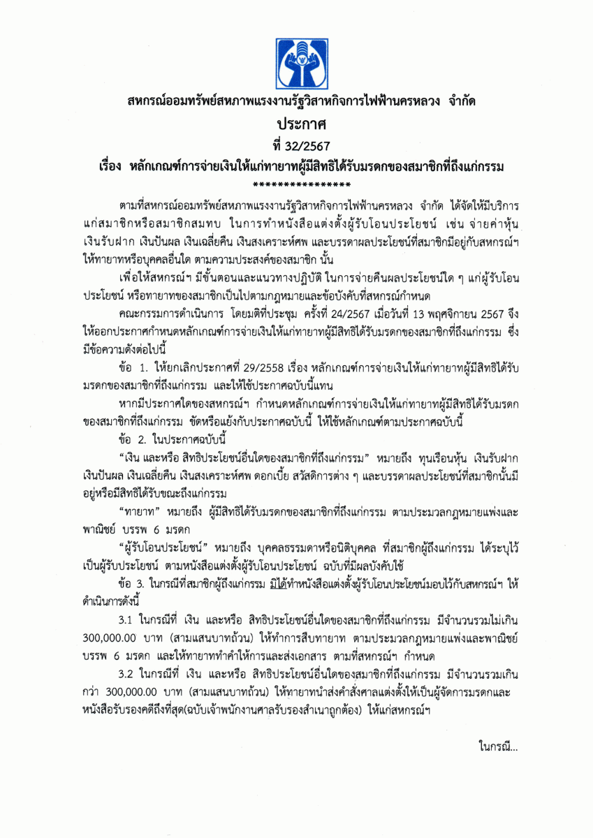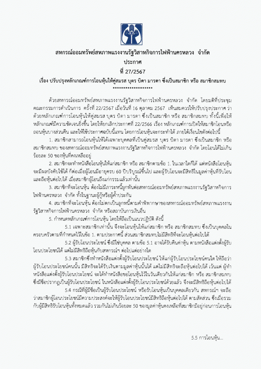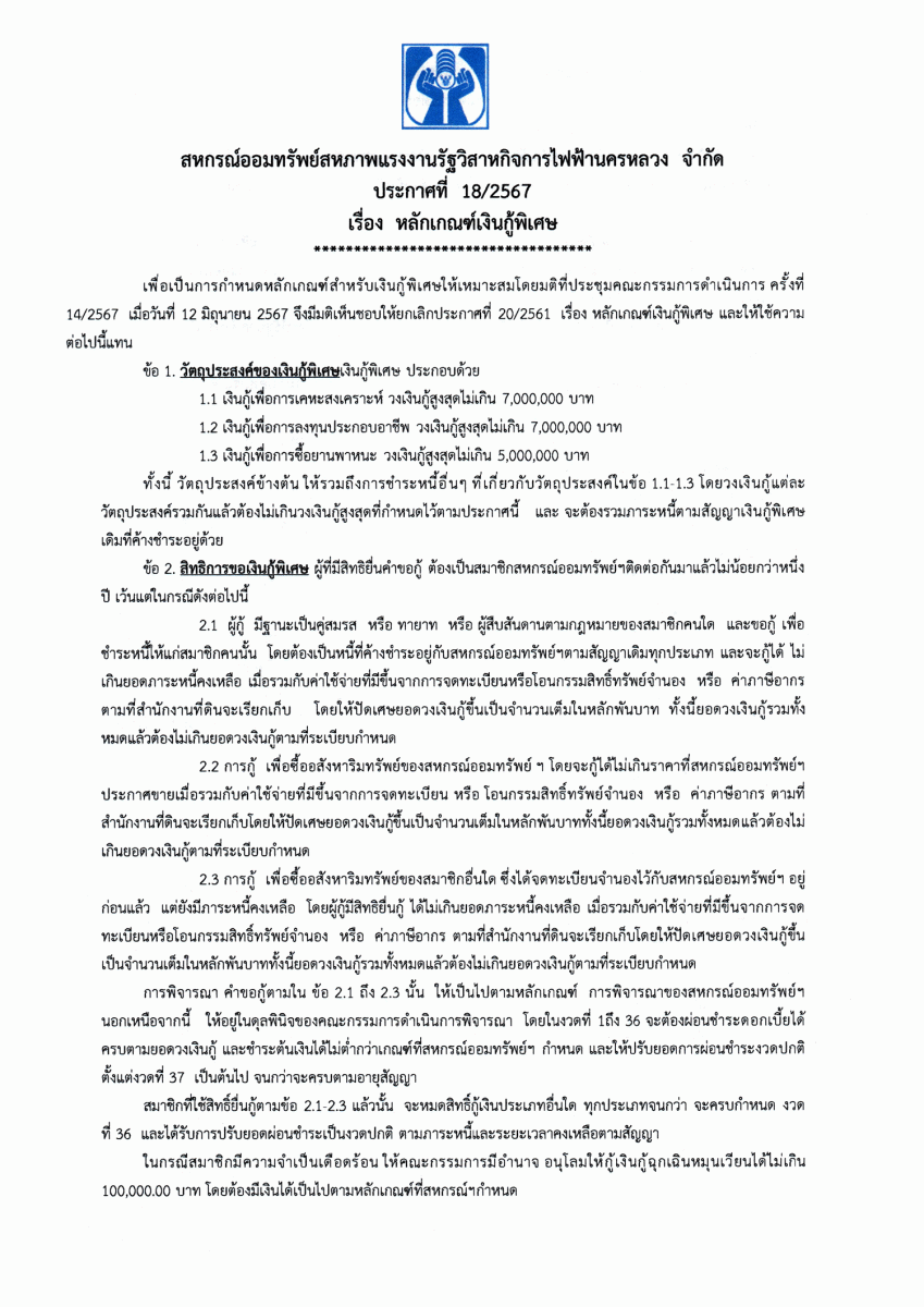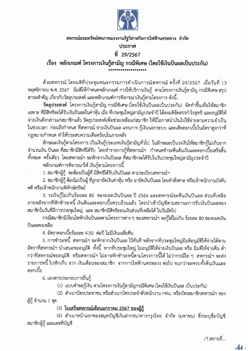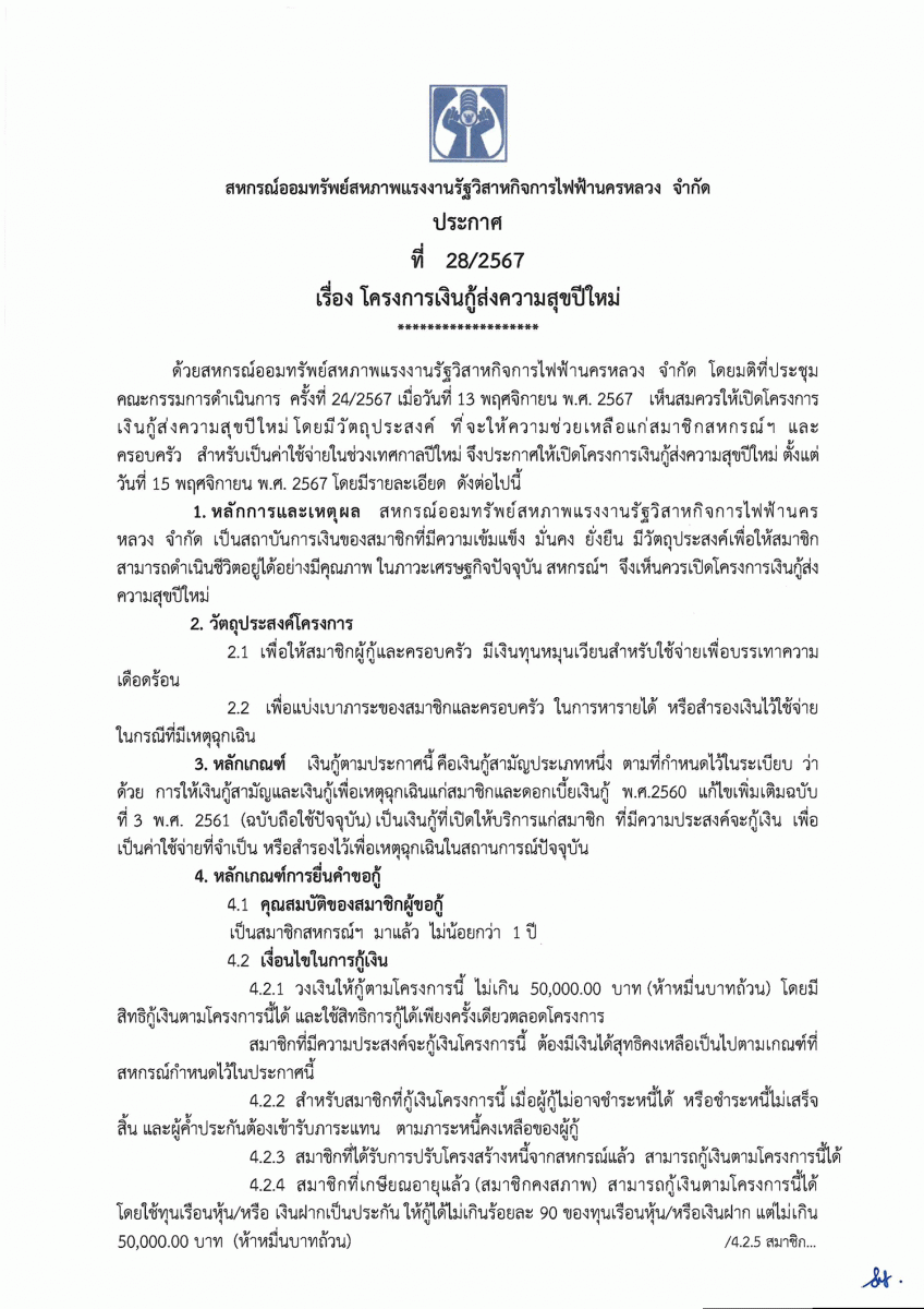 ประกาศที่ 28/2567 เรื่อง โครงการเงินกู้ส่งความสุขปีใหม่