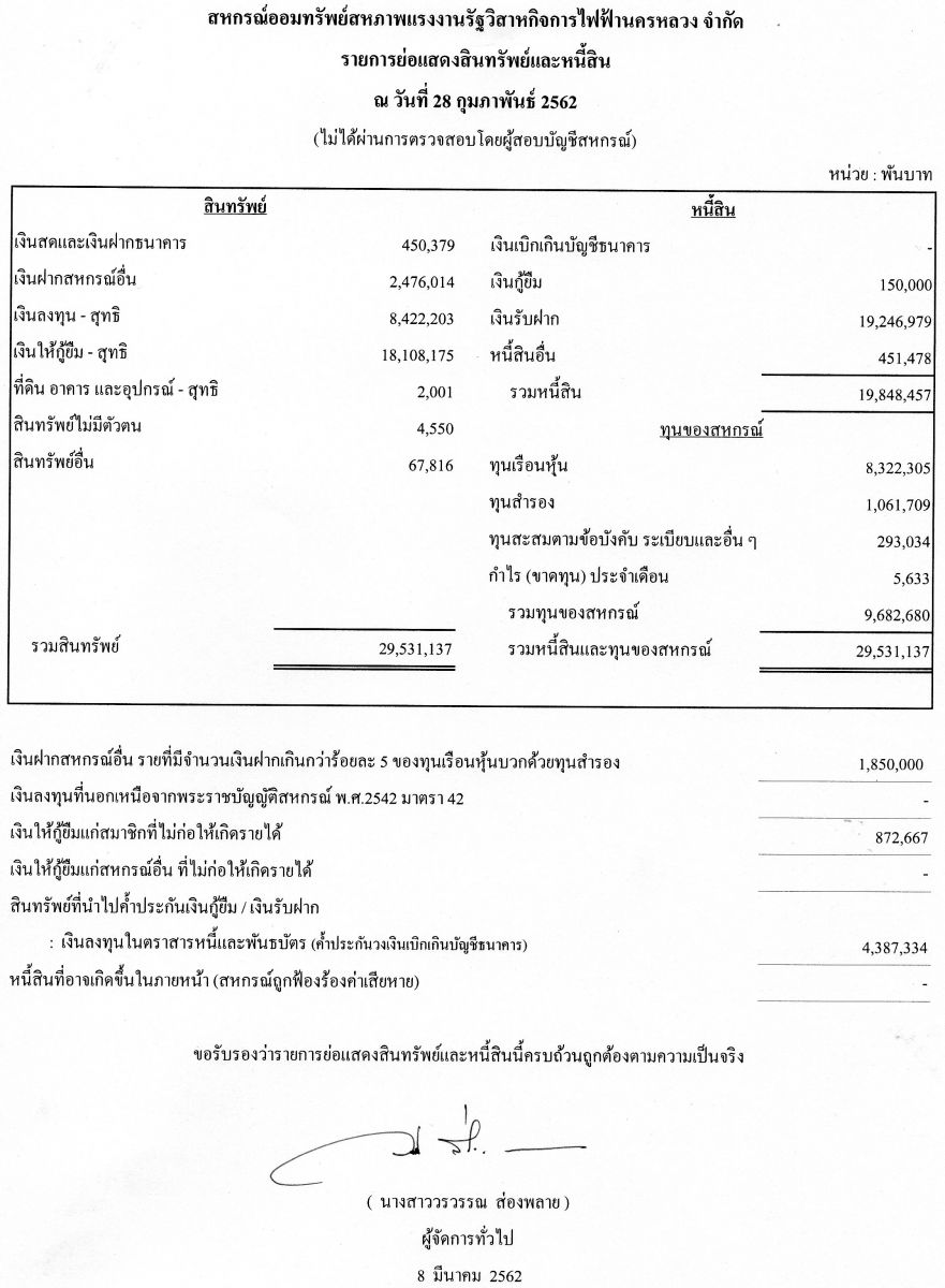 • ประกาศ รายการย่อแสดงทรัพย์สินและหนี้สิน ณ วันที่ 28 กุมภาพันธ์ 2562