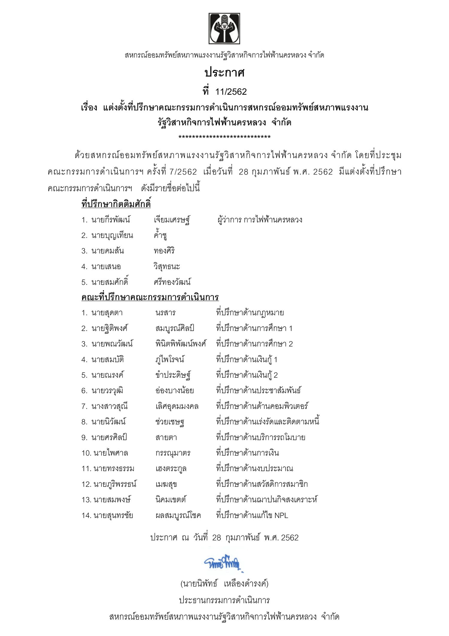 ประกาศที่ 11/2562 เรื่อง แต่งตั้งที่ปรึกษาคณะกรรมการดำเนินการสหกรณ์ออมทรัพย์ฯ