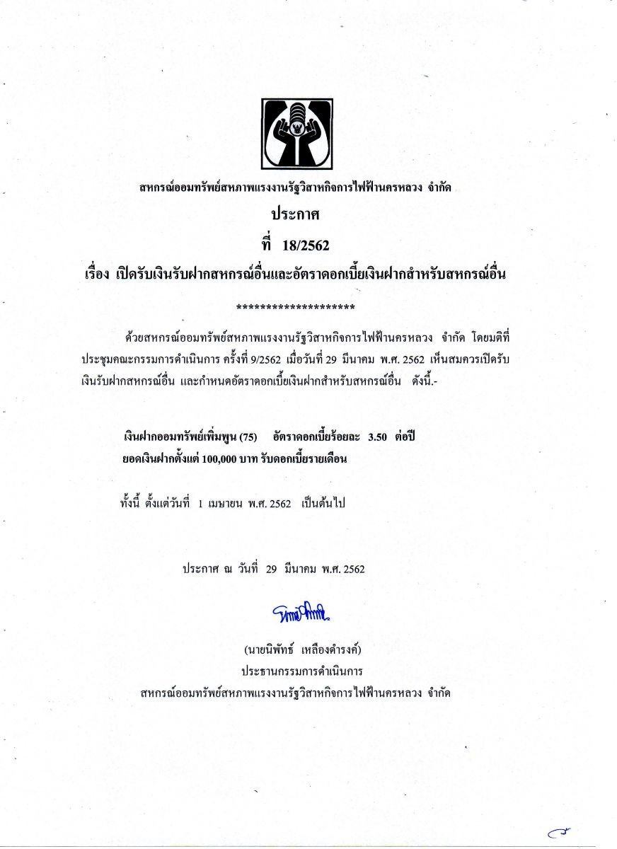 ประกาศ 18/2562 เรื่อง เปิดรับเงินฝากสหกรณ์อื่นและอัตราดอกเบี้ยเงินฝากสำหรับสหกรณ์อื่น