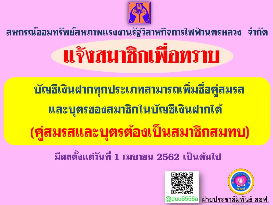 • แจ้งสมาชิกเพื่อทราบ (การเพิ่มชื่อคู่สมรส และบุตรสมาชิก ในบัญชีเงินฝาก)