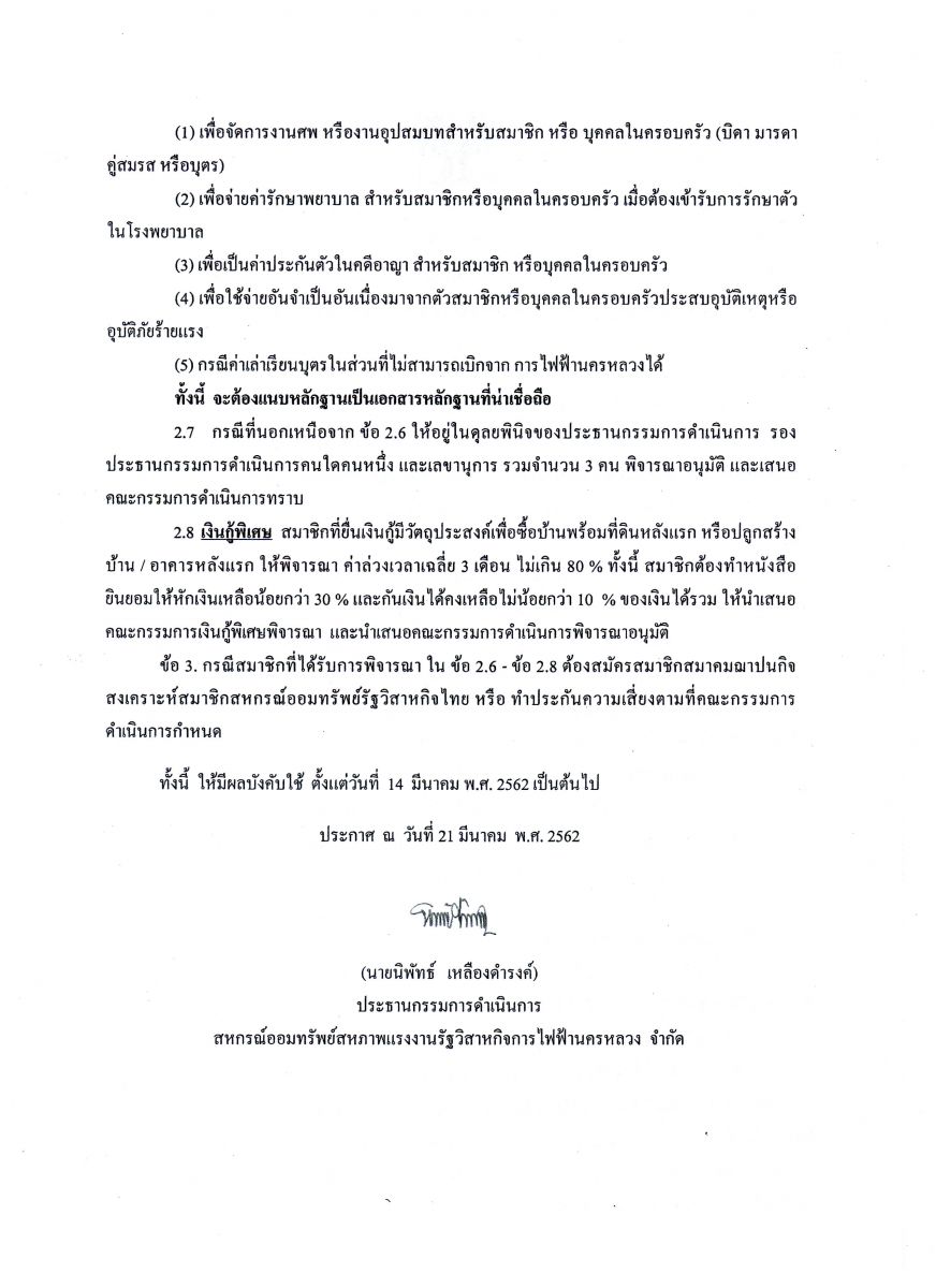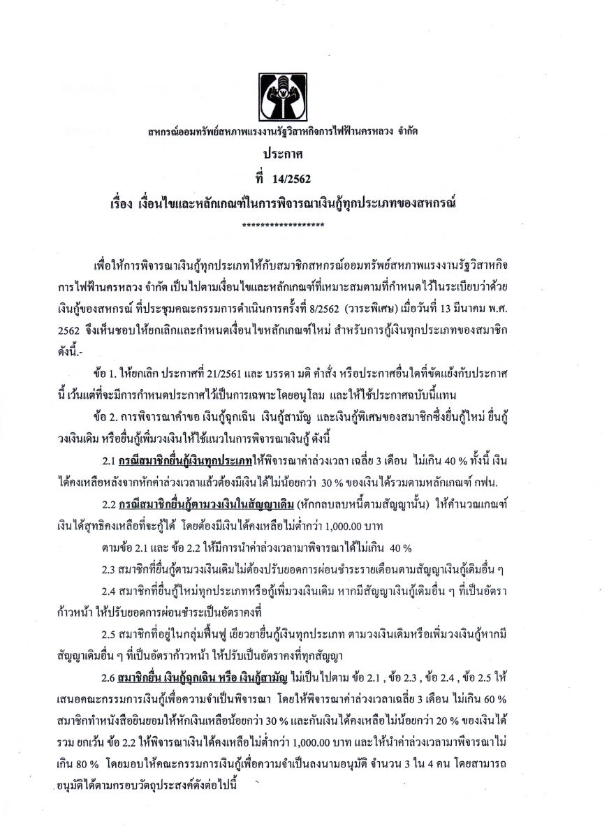 • ประกาศที่ 14/2562 เรื่อง เงื่อนไขและหลักเกณฑ์ในการพิจารณาเงินกู้ทุกประเภทของสหกรณ์