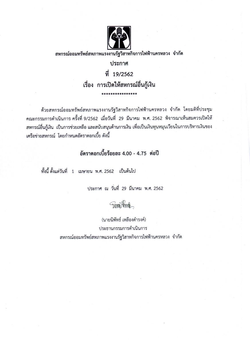 ประกาศที่ 19/2562 เรื่อง การเปิดให้สหกรณ์อื่นกู้เงิน