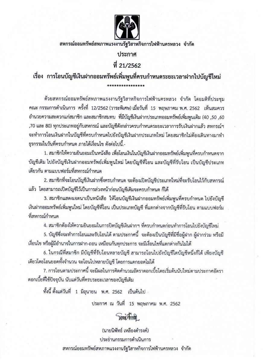ประกาศที่ 21/2562 เรื่อง การโอนบัญชีเงินฝากออมทรัพย์เพิ่มพูนที่ครบกำหนดระยะเวลาฝากไปบัญชีใหม่