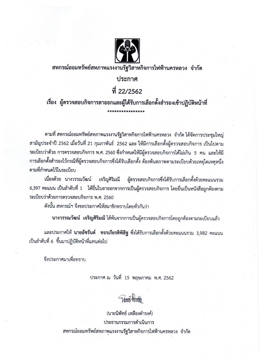 • ประกาศที่ 22/2562 เรื่อง ผู้ตรวจสอบกิจการลาออกและผู้ได้รับการเลือกตั้งสำรองเข้าปฏิบัติหน้าที่