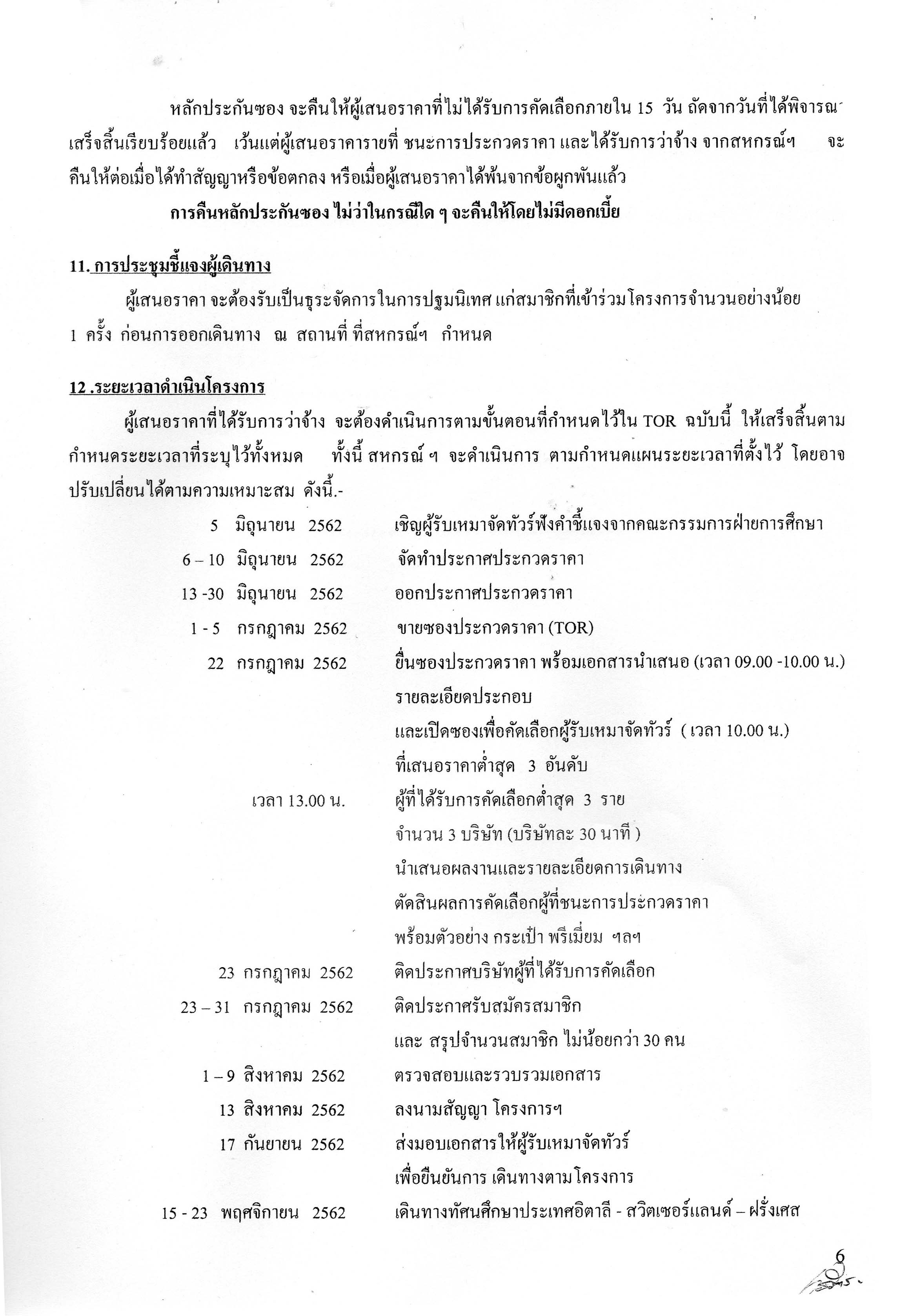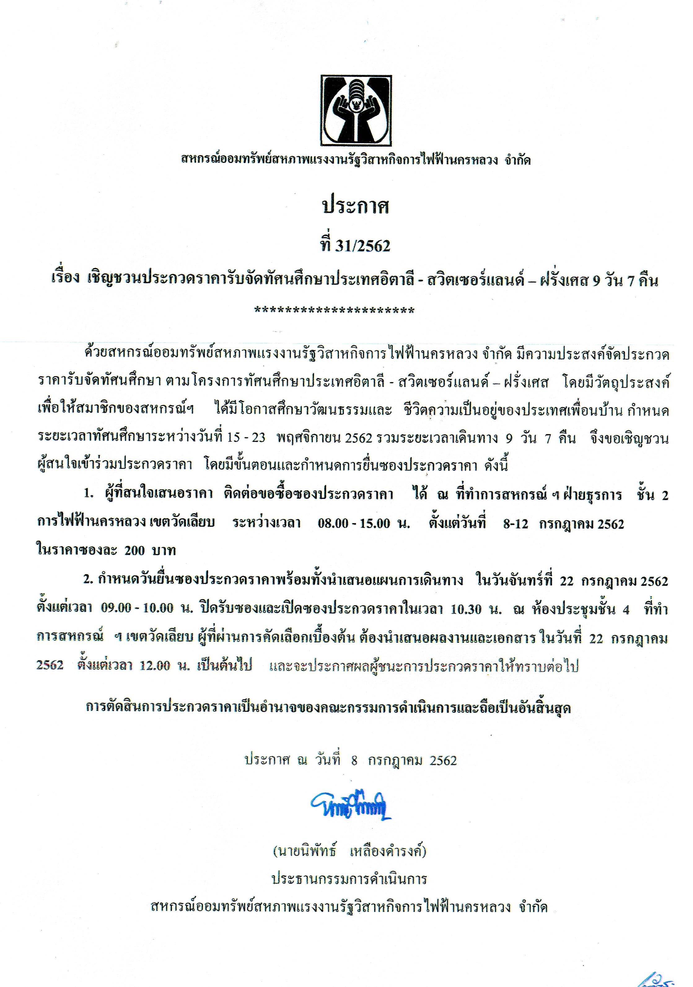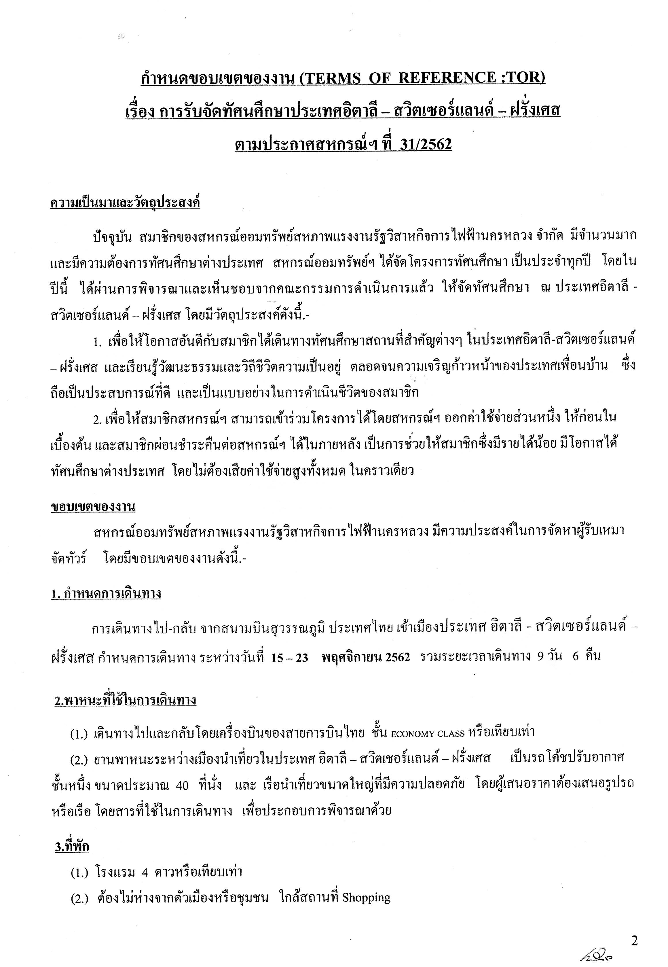 • ประกาศที่ 31/2562 เรื่อง เชิญชวนประกวดราคารับจัดทัศนศึกษาประเทศอิตาลี - สวิตเซอร์แลนด์ - ฝรั่งเศส