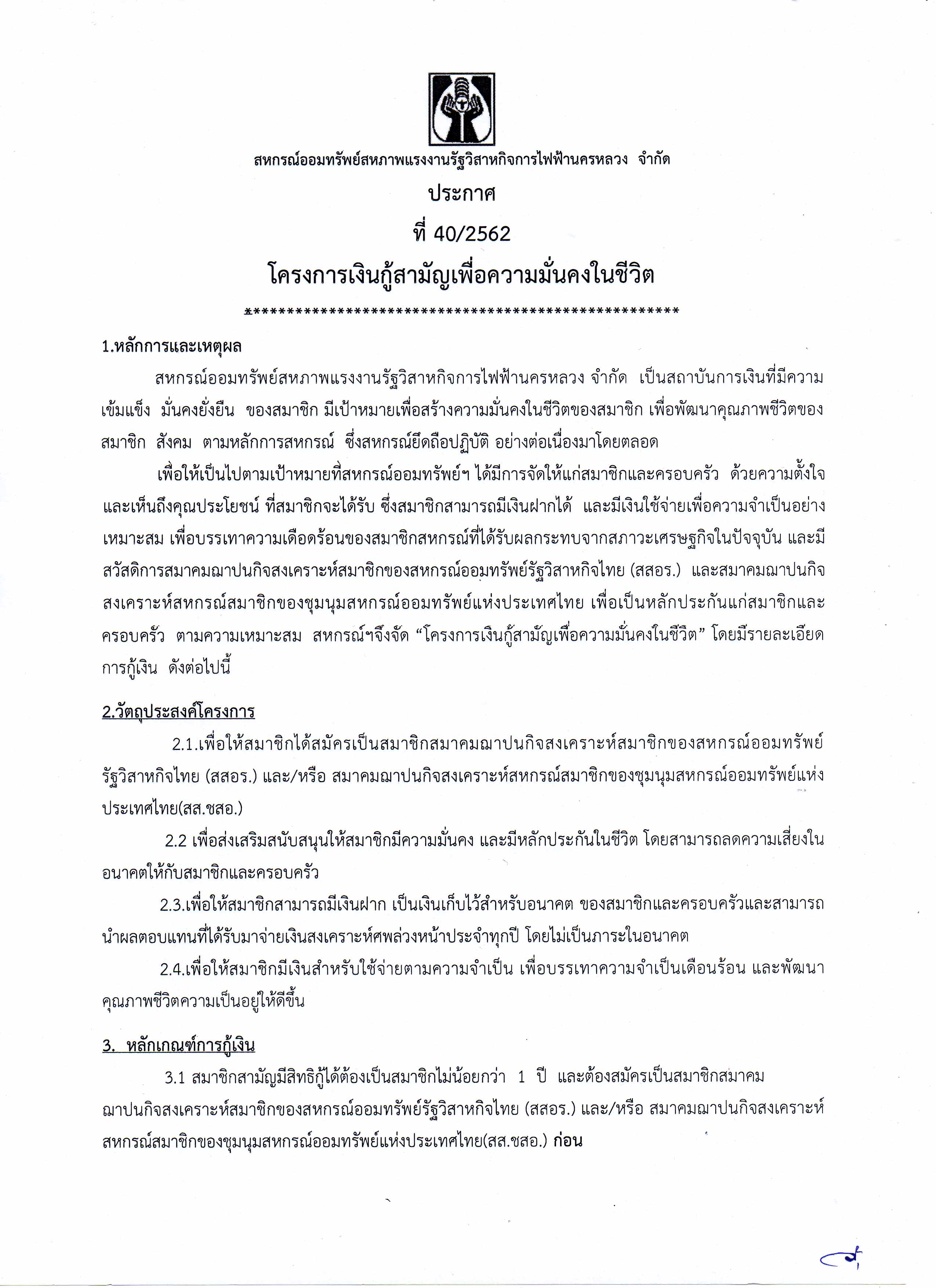 ประกาศที่ 40/2562 โครงการเงินกู้สามัญเพื่อความมั่นคงในชีวิต