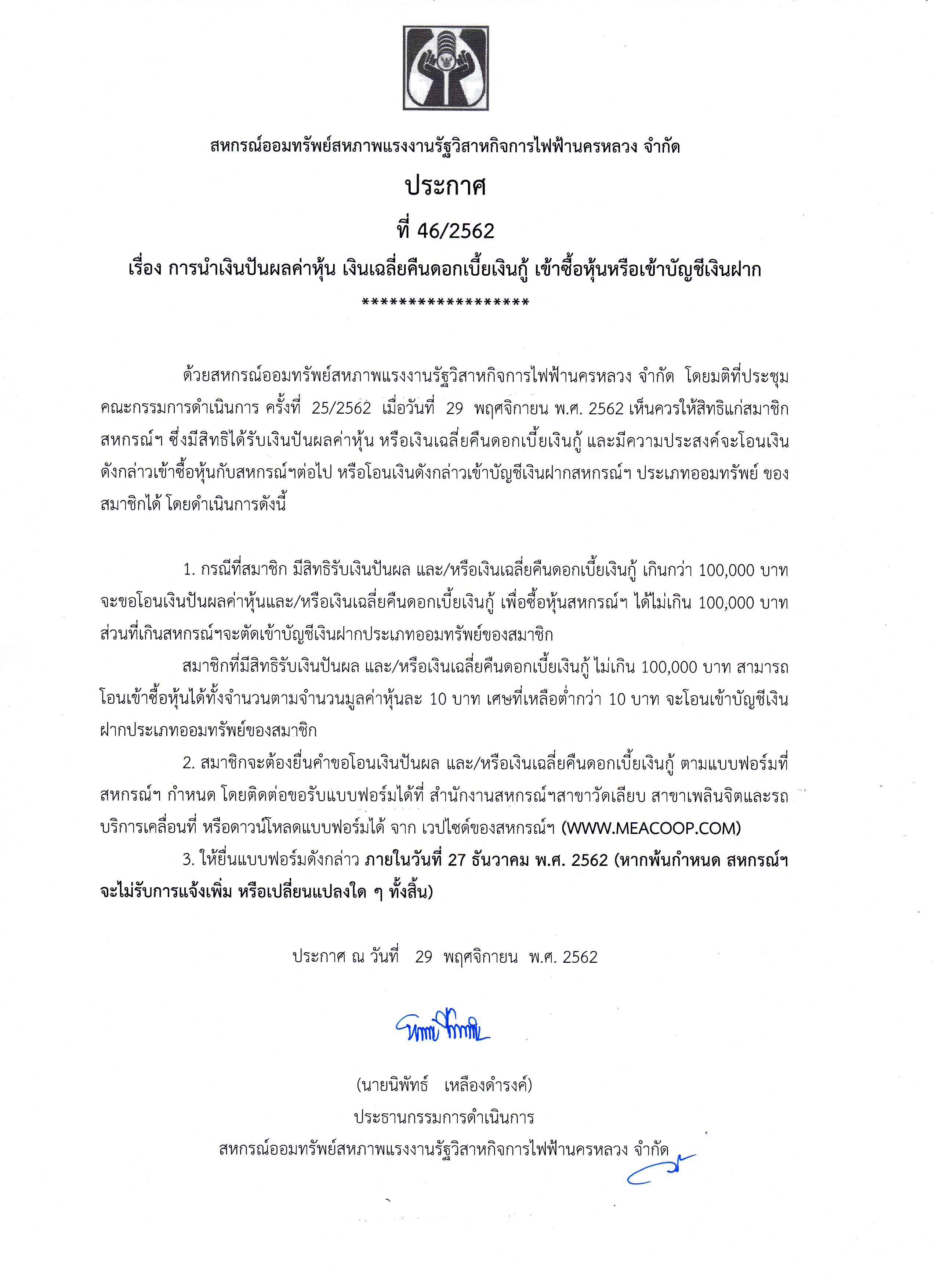 ประกาศที่ 46/2562 เรื่อง การนำปันผลค่าหุ้น เงินเฉลี่ยคืนดอกเบี้ยเงินกู้ เข้าซื้อหุ้นหรือเข้าบัญชีเงินฝาก