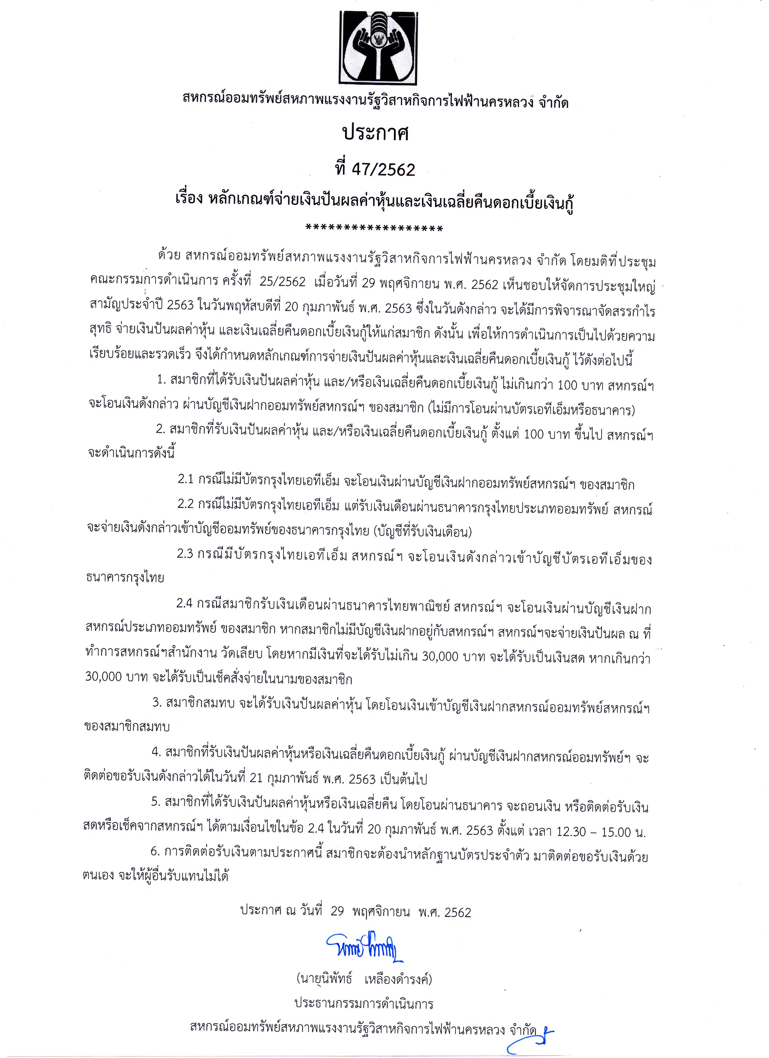 • ประกาศที่ 47/2562 เรื่อง หลักเกณฑ์จ่ายเงินปันผลค่าหุ้นและเงินเฉลี่ยคืนดอกเบี้ยเงินกู้