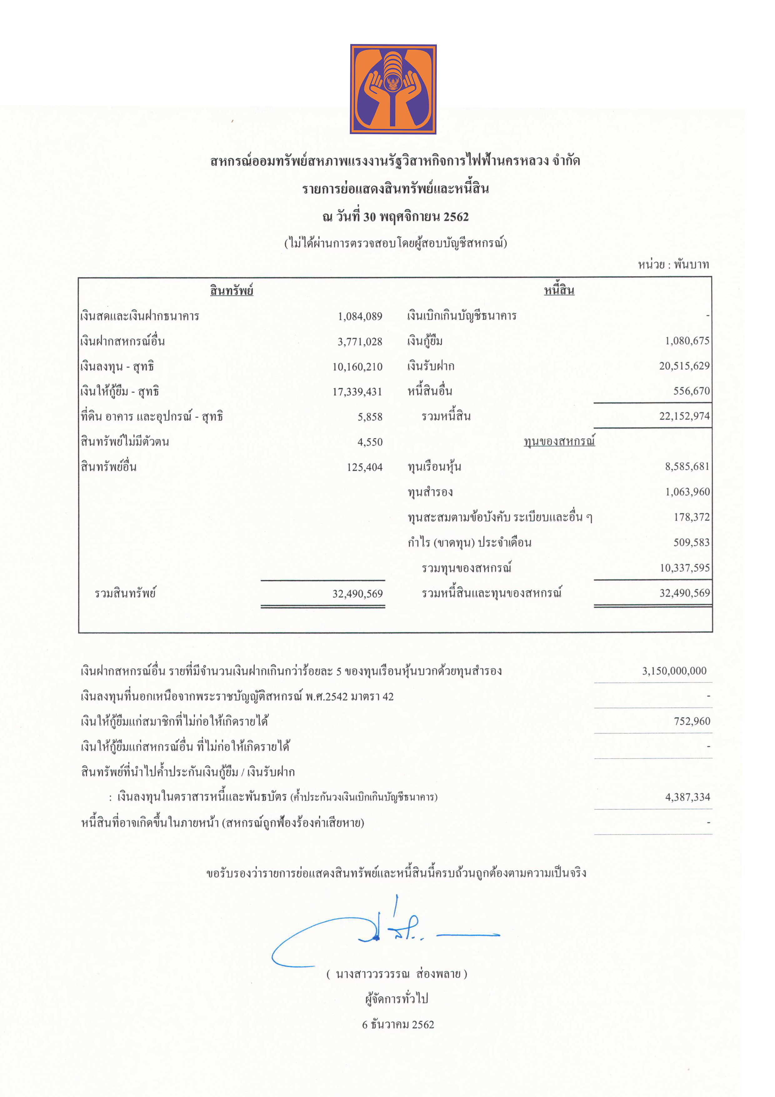 • ประกาศ รายการย่อแสดงทรัพย์สินและหนี้สิน ณ วันที่ 30 พฤศจิกายน 2562