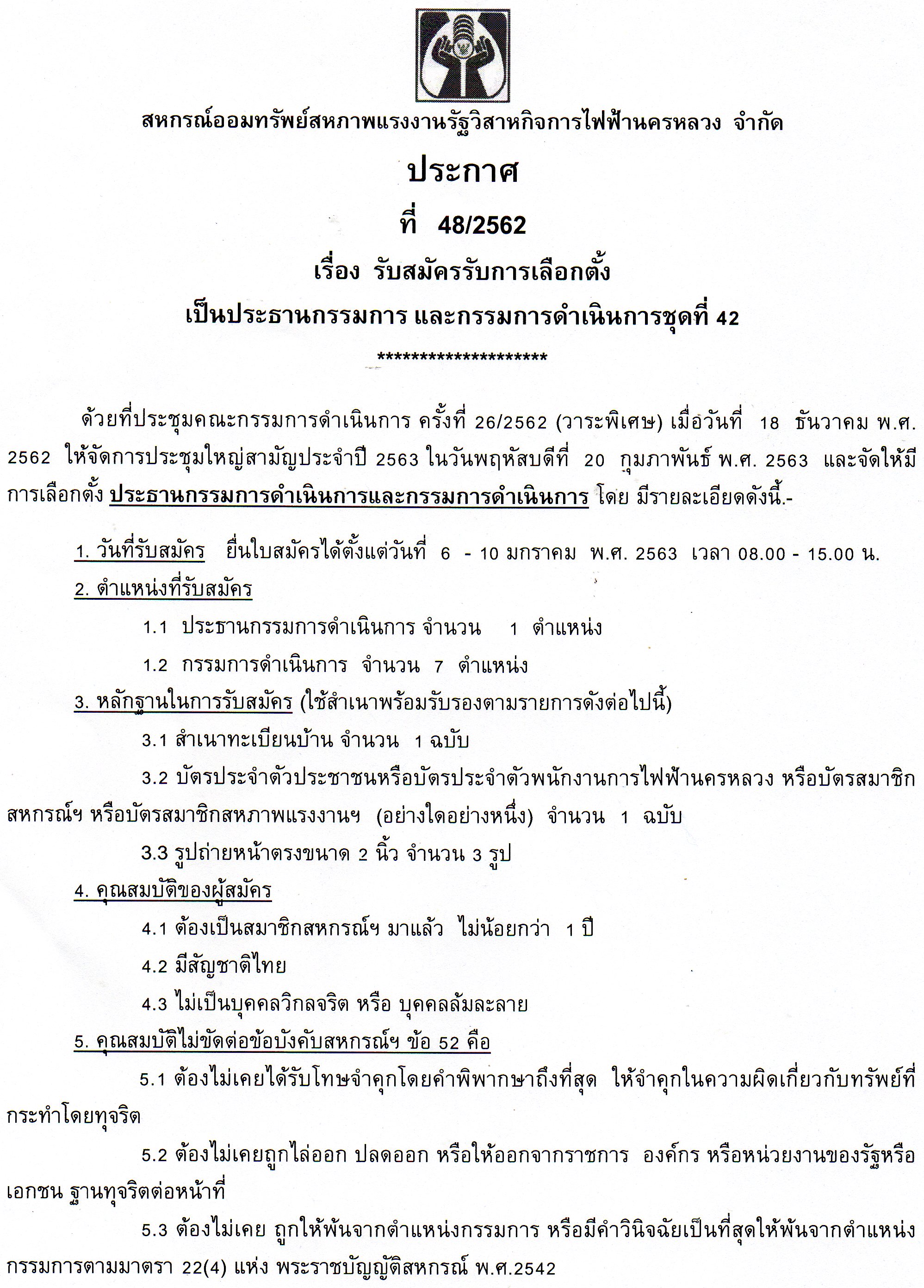 ประกาศที่ 48/2562 เรื่อง รับสมัครรับเลือกตั้งเป็นประธานกรรมการ และกรรการ ชุดที่ 42