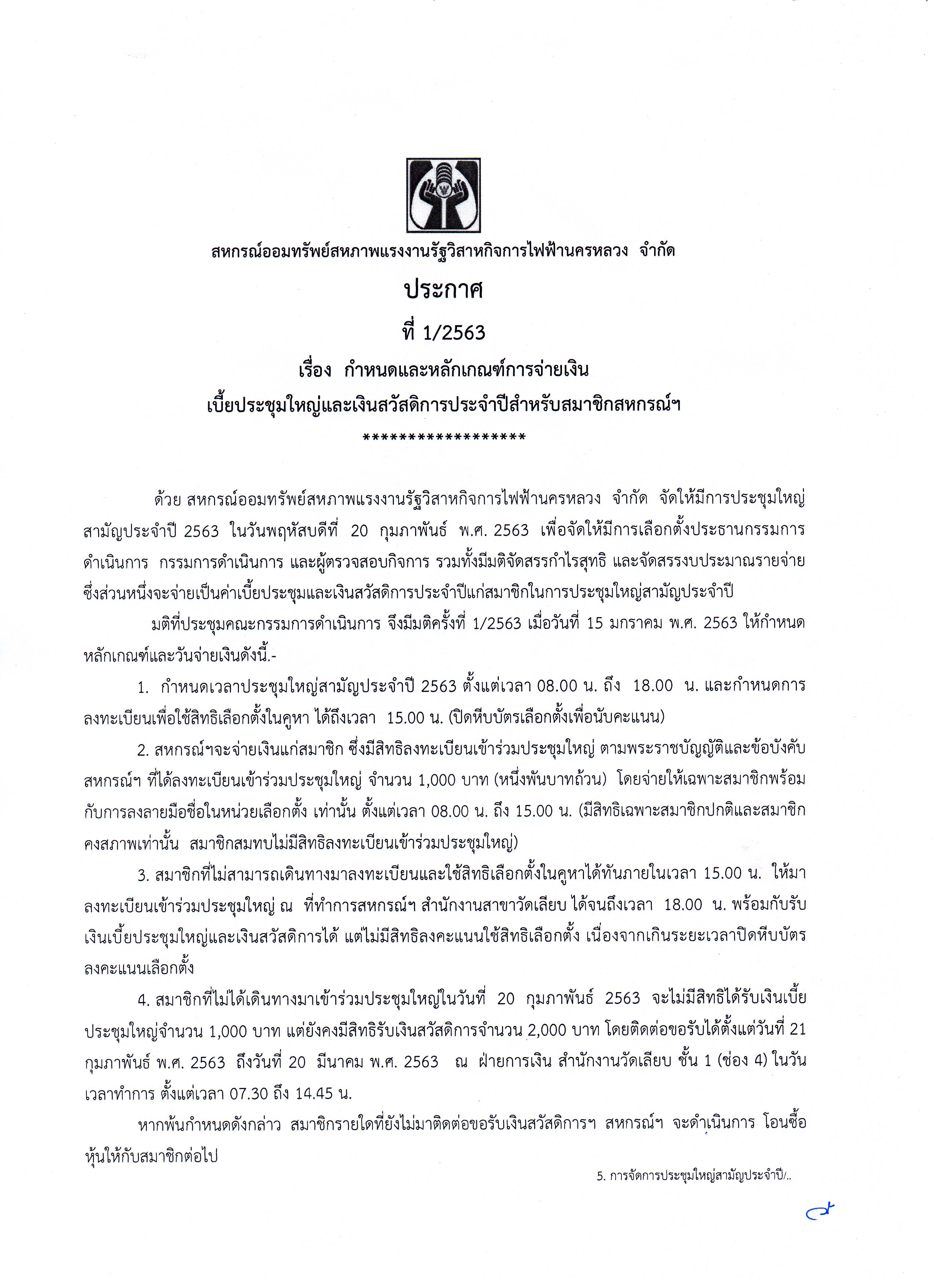 ประกาศที่ 1/2563 เรื่อง กำหนดและหลักเกณฑ์การจ่ายเงินเบี้ยประชุมใหญ่และเงินสวัสดิการประจำปีสำหรับสมาชิกสหกรณ์ฯ