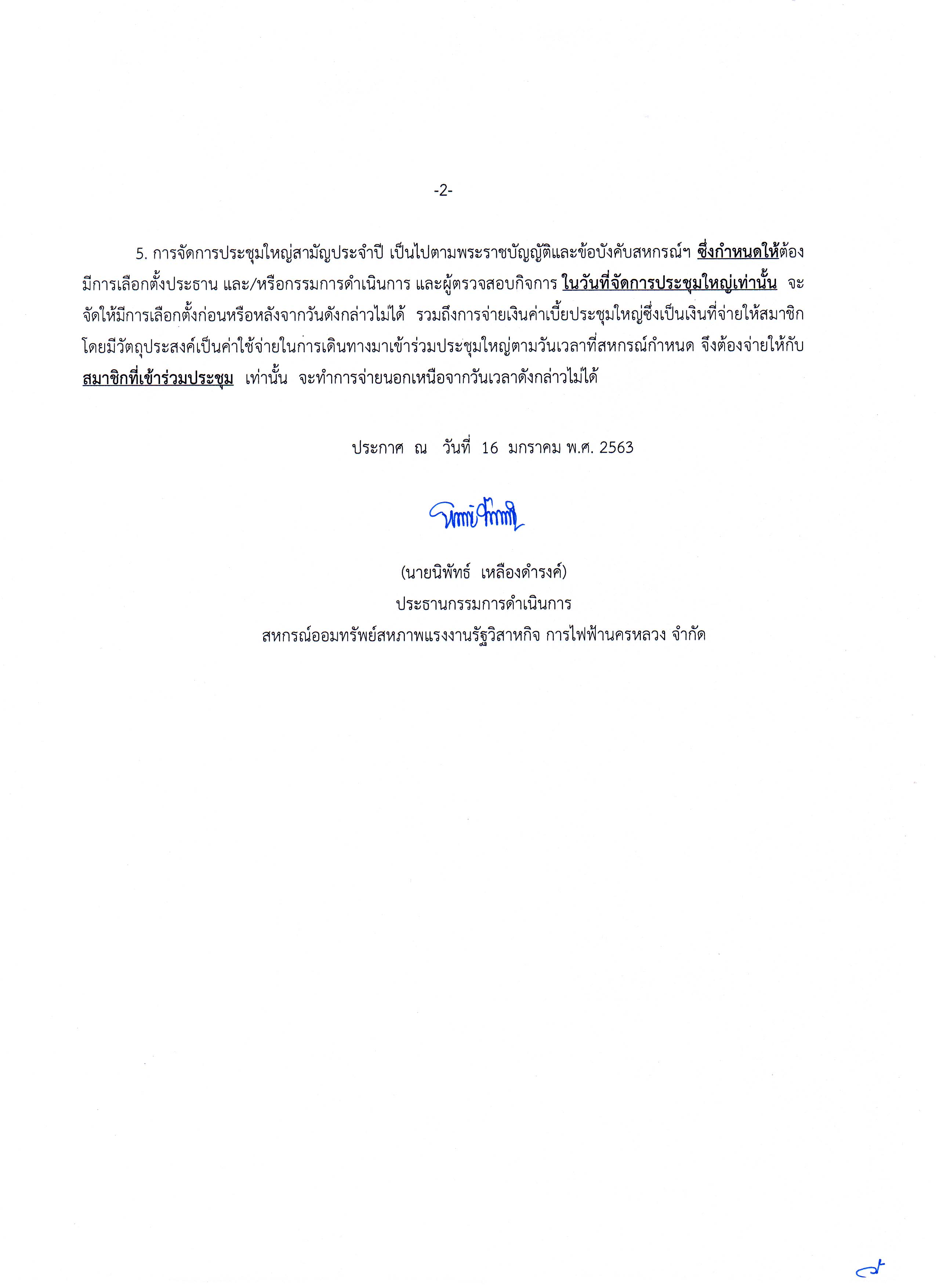 • ประกาศที่ 1/2563 เรื่อง กำหนดและหลักเกณฑ์การจ่ายเงินเบี้ยประชุมใหญ่และเงินสวัสดิการประจำปีสำหรับสมาชิกสหกรณ์ฯ