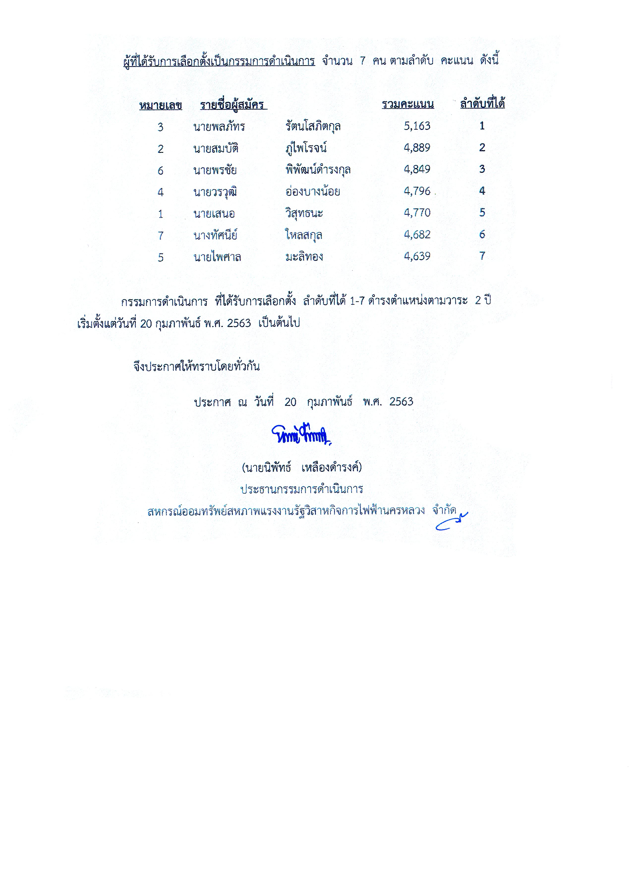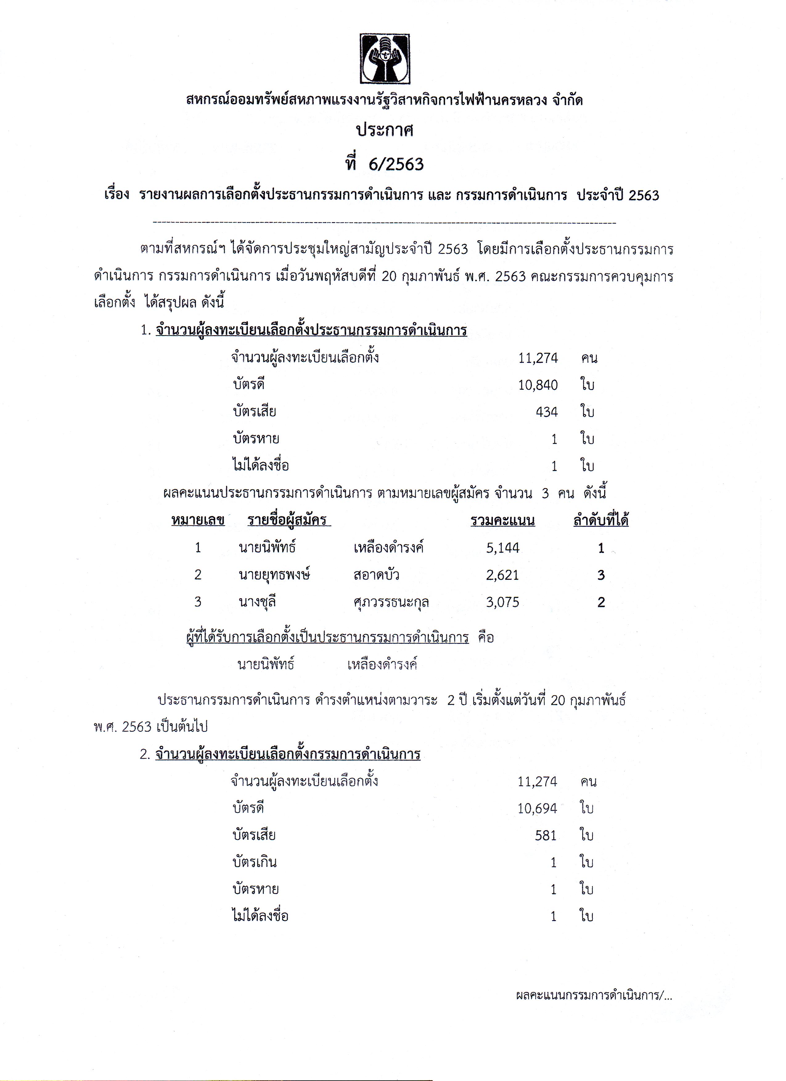 • ประกาศที่ 6/2563 เรื่อง รายงานผลการเลือกตั้งประธานกรรมการดำเนินการ และกรรมการดำเนินการ ประจำปี 2563