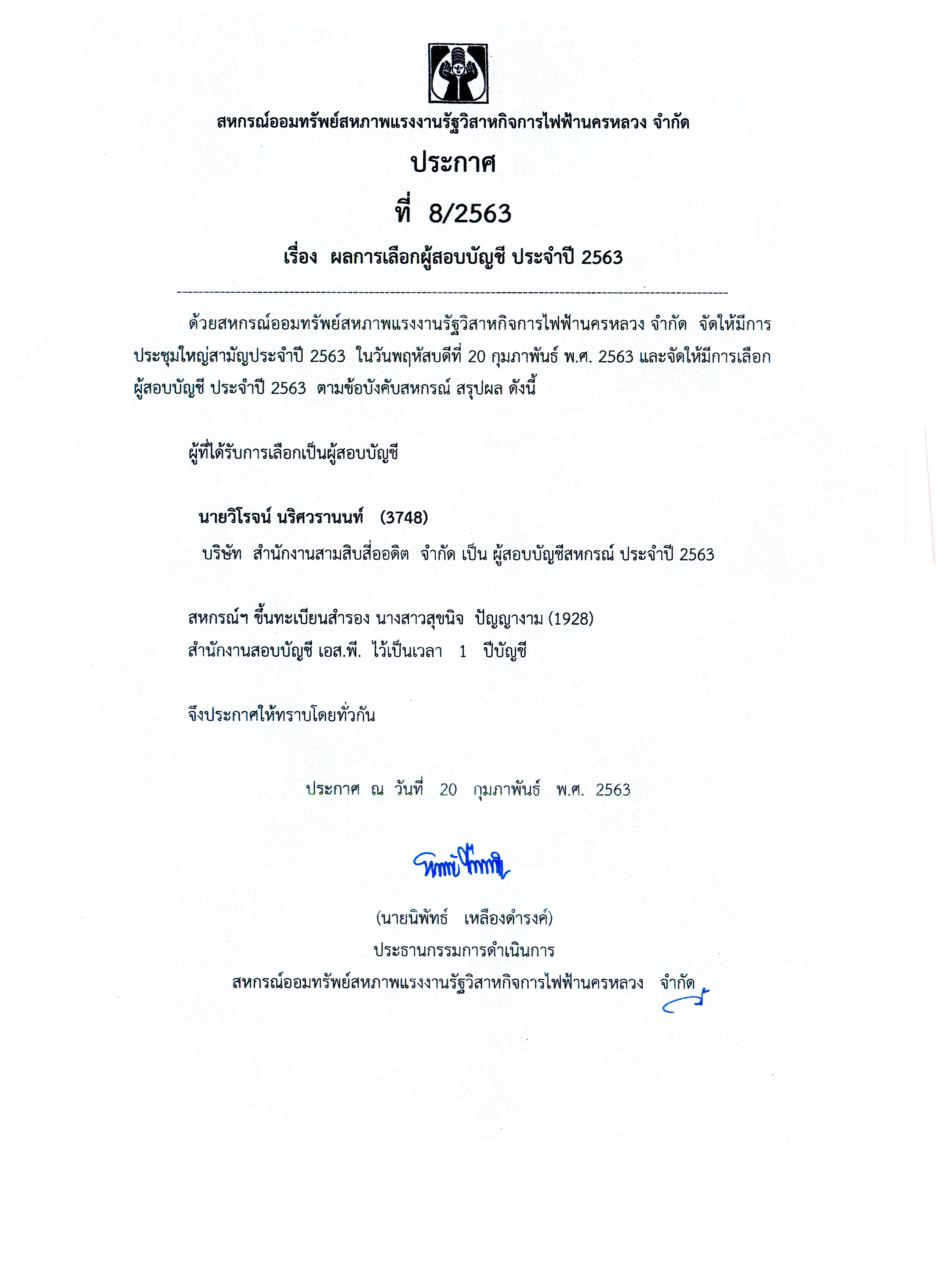 • ประกาศที่ 8/2563 เรื่อง ผลการเลือกผู้สอบบัญชี ประจำปี 2563