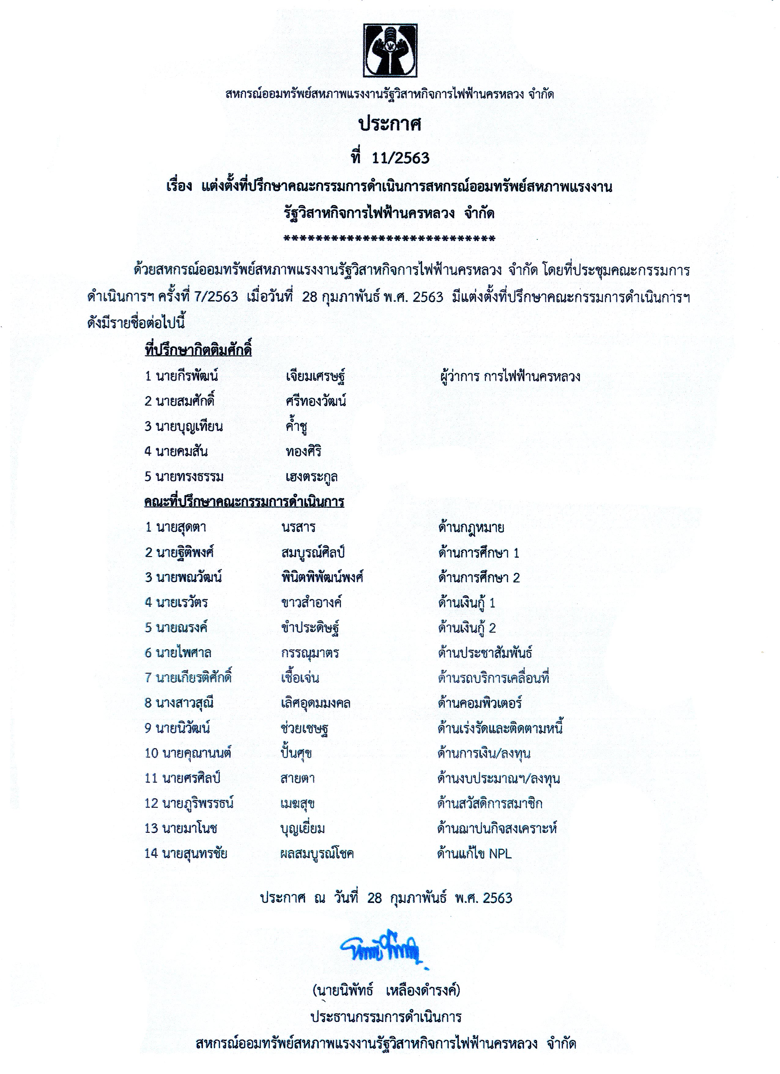 ประกาศที่ 11/2563 เรื่อง แต่งตั้งที่ปรึกษาคณะกรรมการดำเนินการสหกรณ์ออมทรัพย์ ฯ