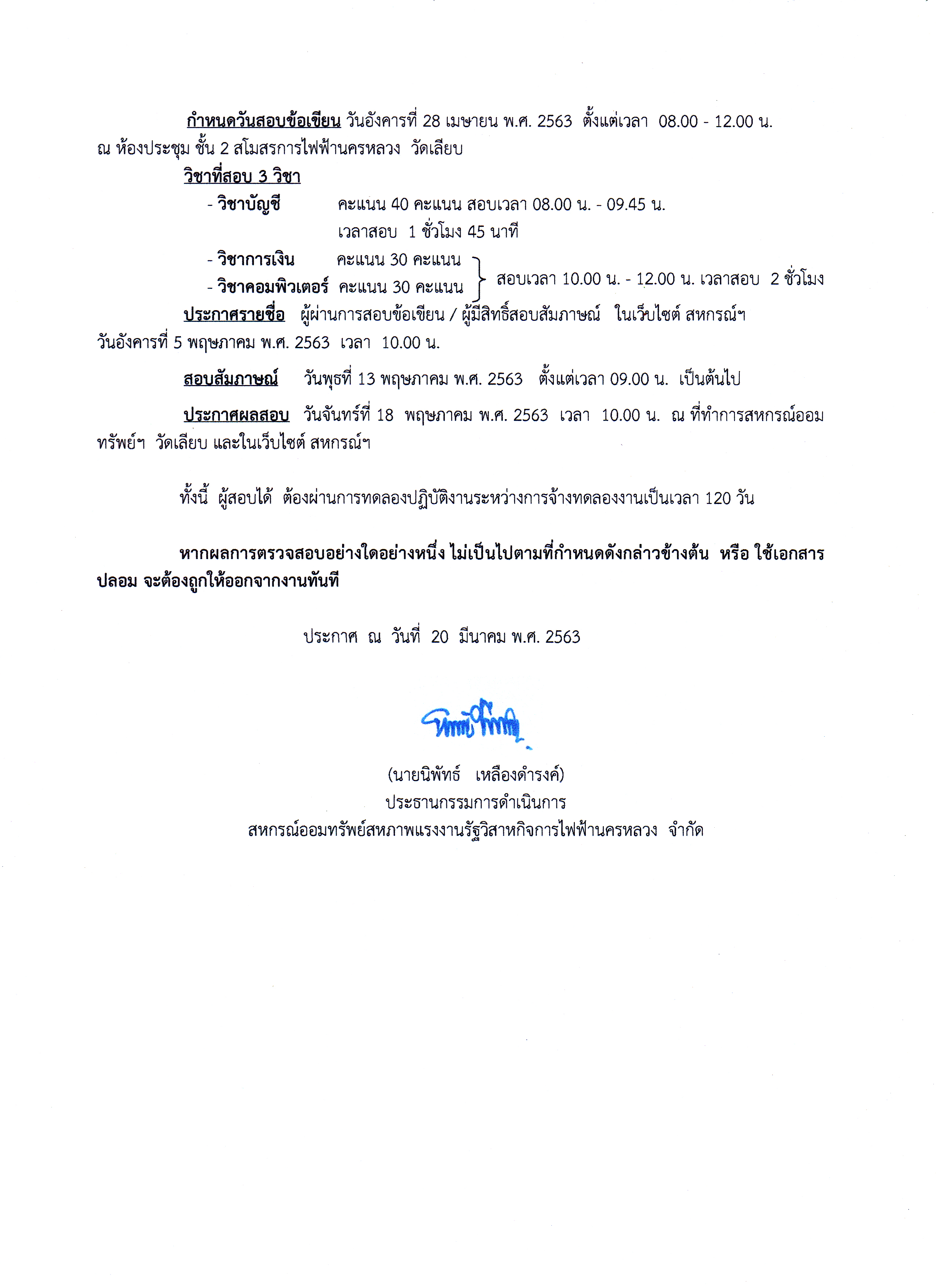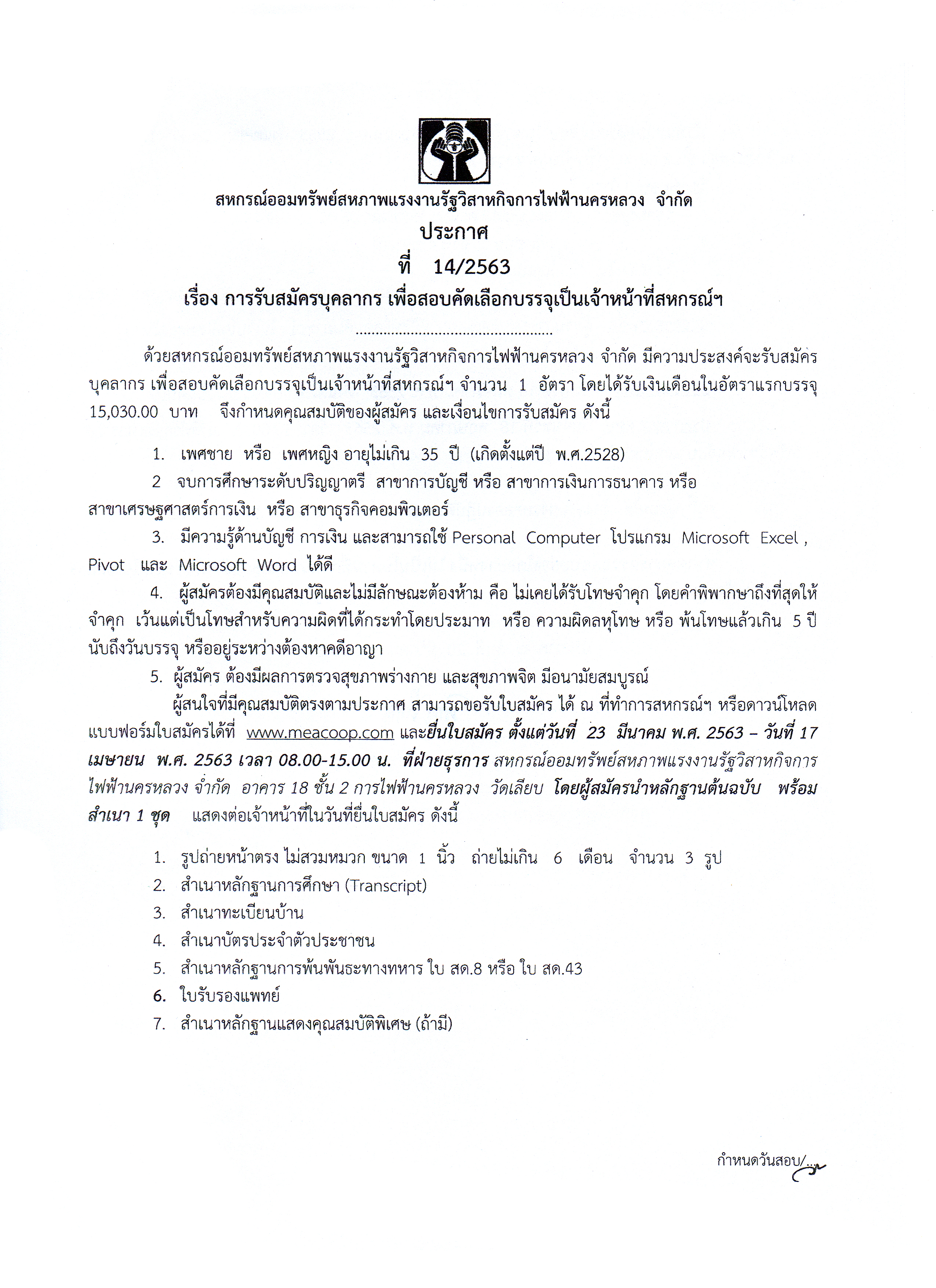 • ประกาศที่ 14/2563 เรื่อง การรับสมัครบุคคลากร เพื่อสอบคัดเลือกบรรจุเป็นเจ้าหน้าที่สหกรณ์ฯ