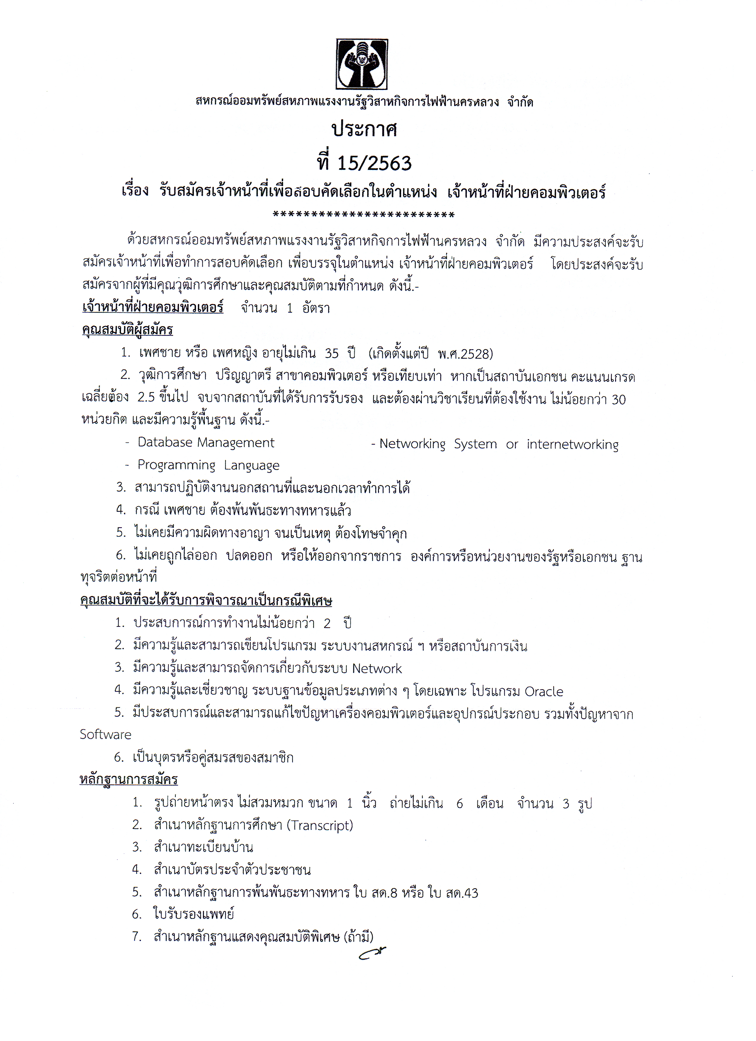 ประกาศที่ 15/2563 เรื่อง รับสมัครเจ้าหน้าที่เพื่อสอบคัดเลือกในตำแหน่ง เจ้าหน้าที่ฝ่ายคอมพิวเตอร์