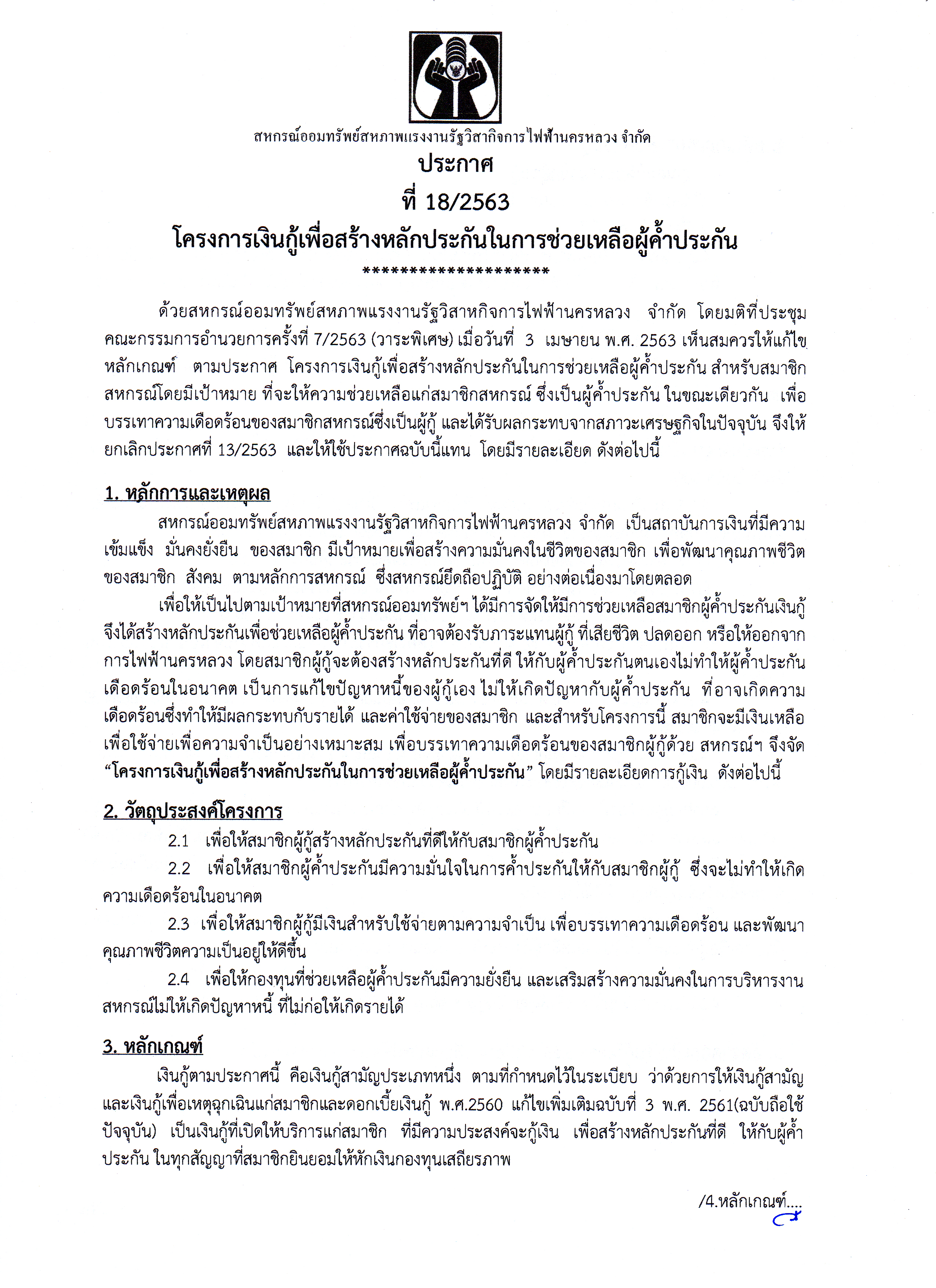 ประกาศที่ 18/2563 เรื่อง โครงการเงินกู้เพื่อหลักประกันในการช่วยเหลือผู้ค้ำประกัน