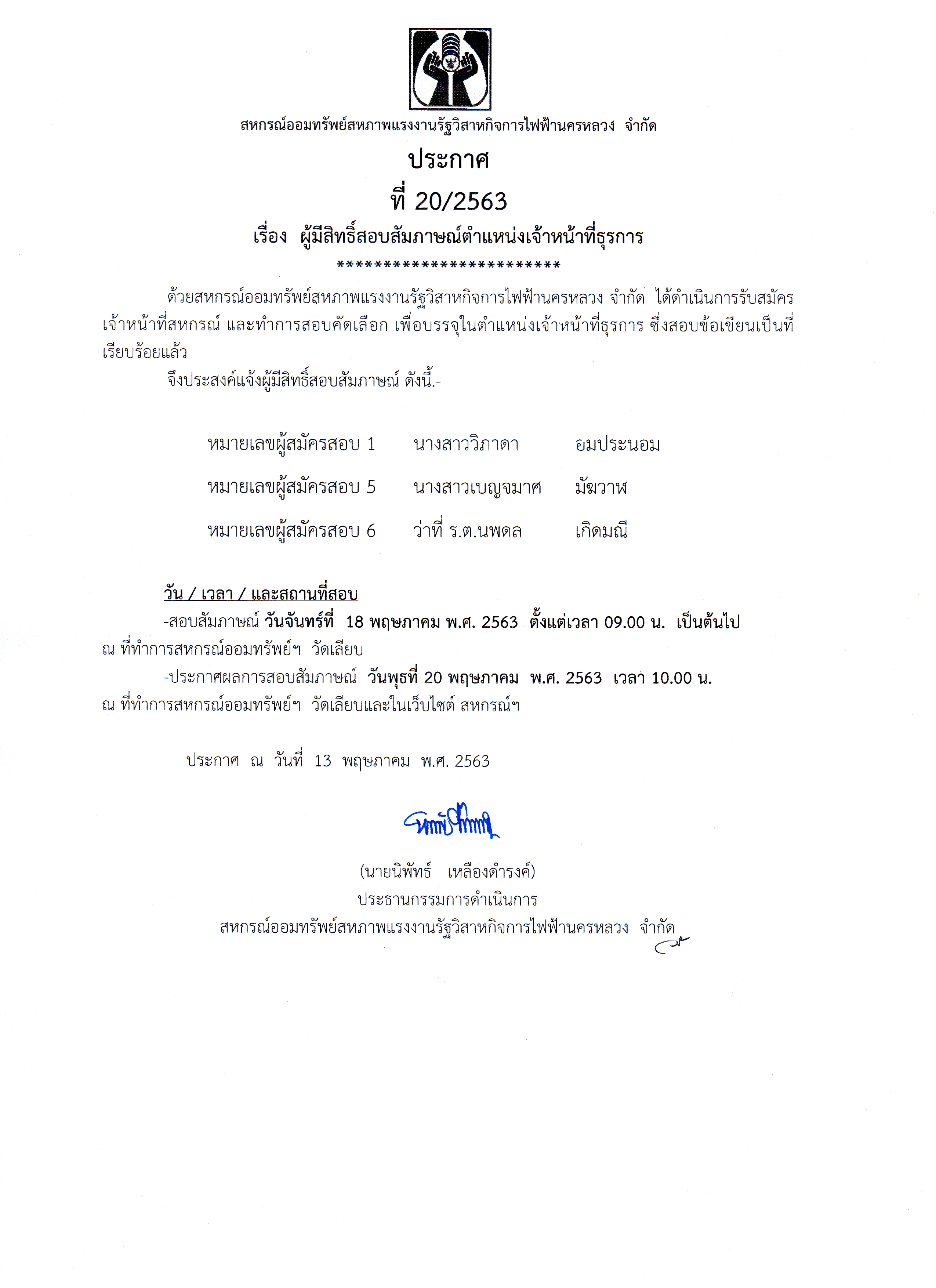 • ประกาศที่ 20/2563 เรื่อง ผู้มีสิทธิ์สอบสัมภาษณ์ตำแหน่งเจ้าหน้าที่ธุรการ