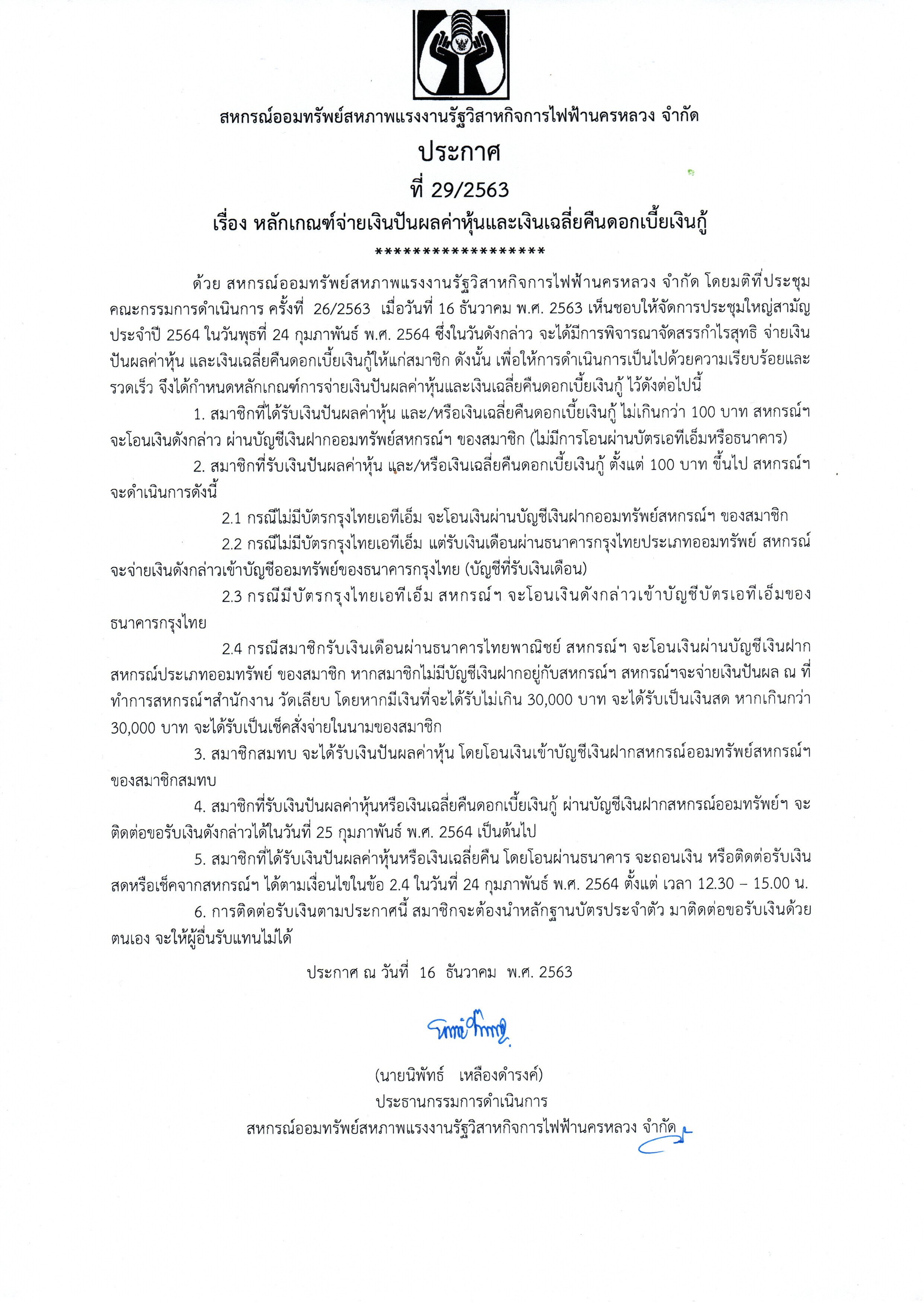 • ประกาศที่ 29/2563 เรื่อง หลักเกณฑ์การจ่ายเงินปันผลค่าหุ้นและเงินเฉลี่ยคืนดอกเบี้ยเงินกู้