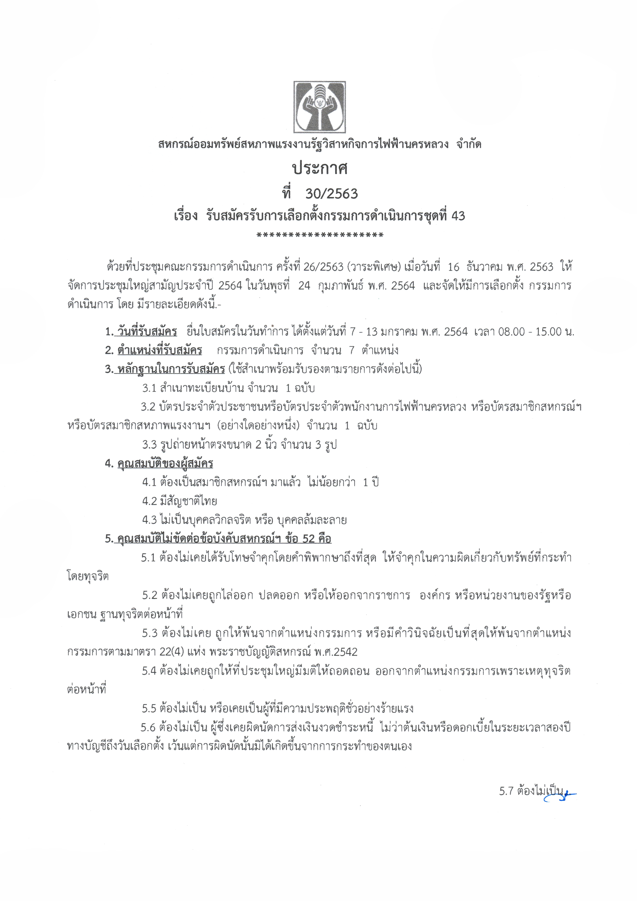• ประกาศที่ 30/2563 เรื่อง รับสมัครรับการเลือกตั้งกรรมการดำเนินการชุดที่ 43