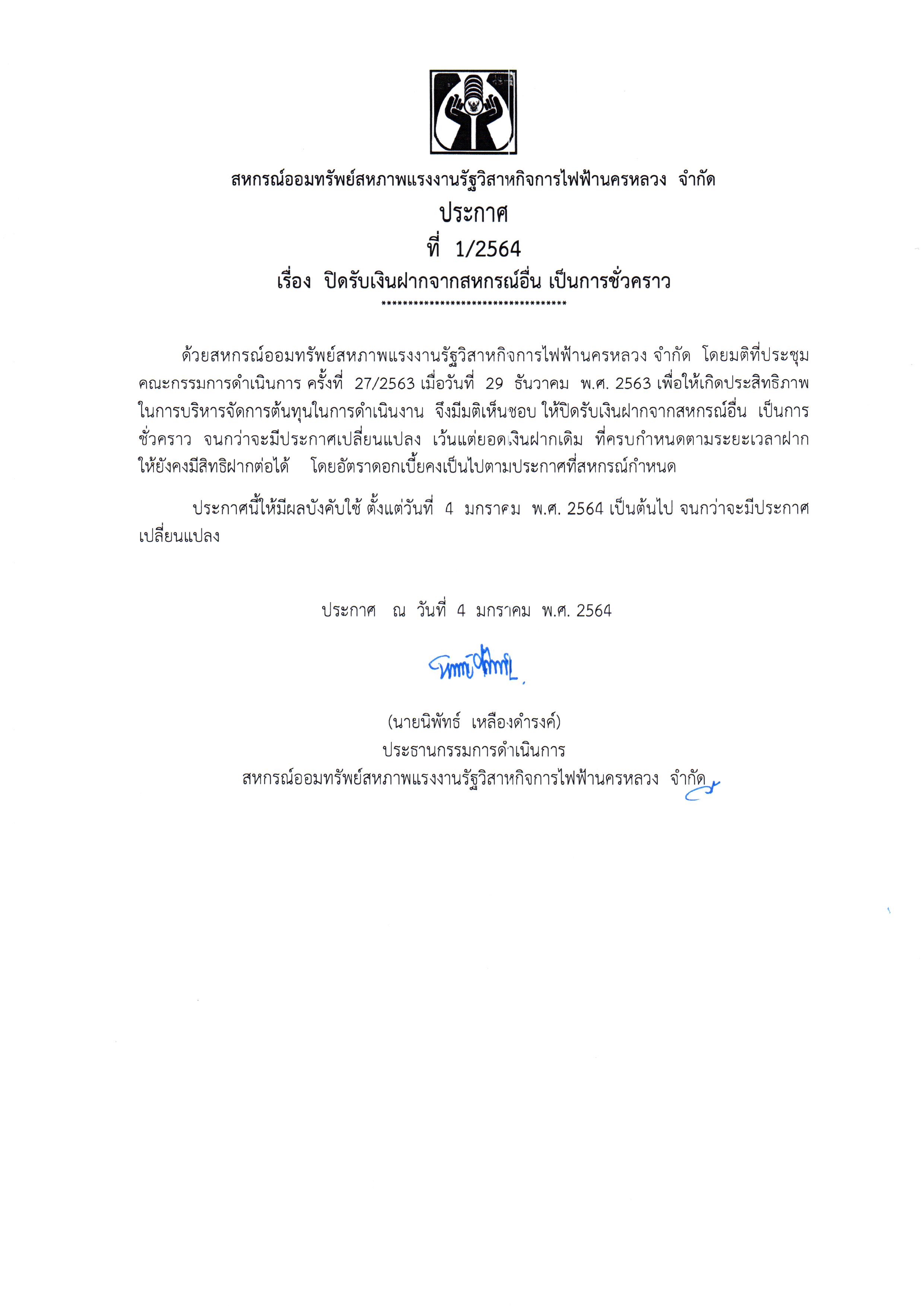 ประกาศที่ 1/2564 เรื่อง ปิดรับเงินฝากจากสหกรณ์อื่น เป็นการชั่วคราว