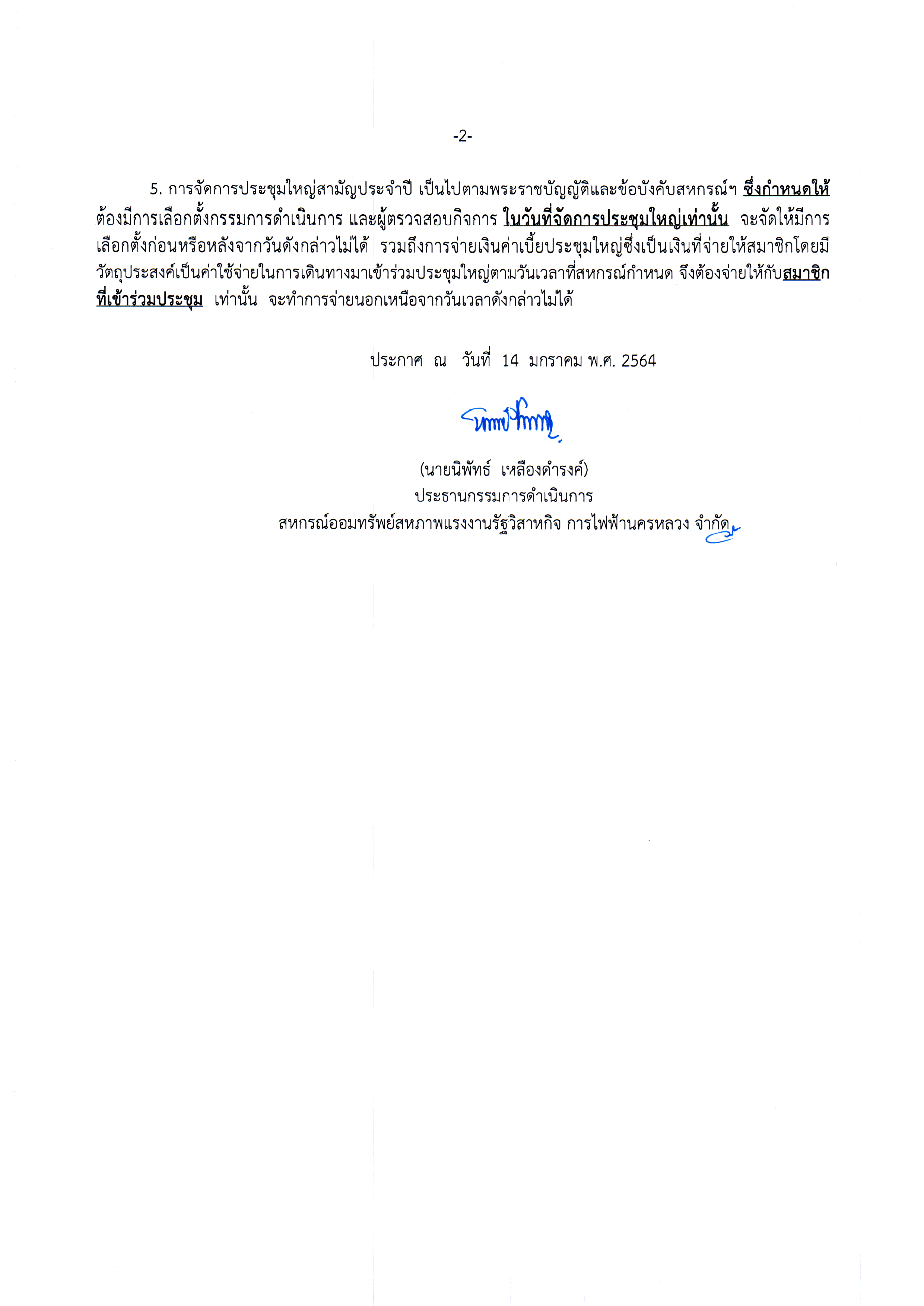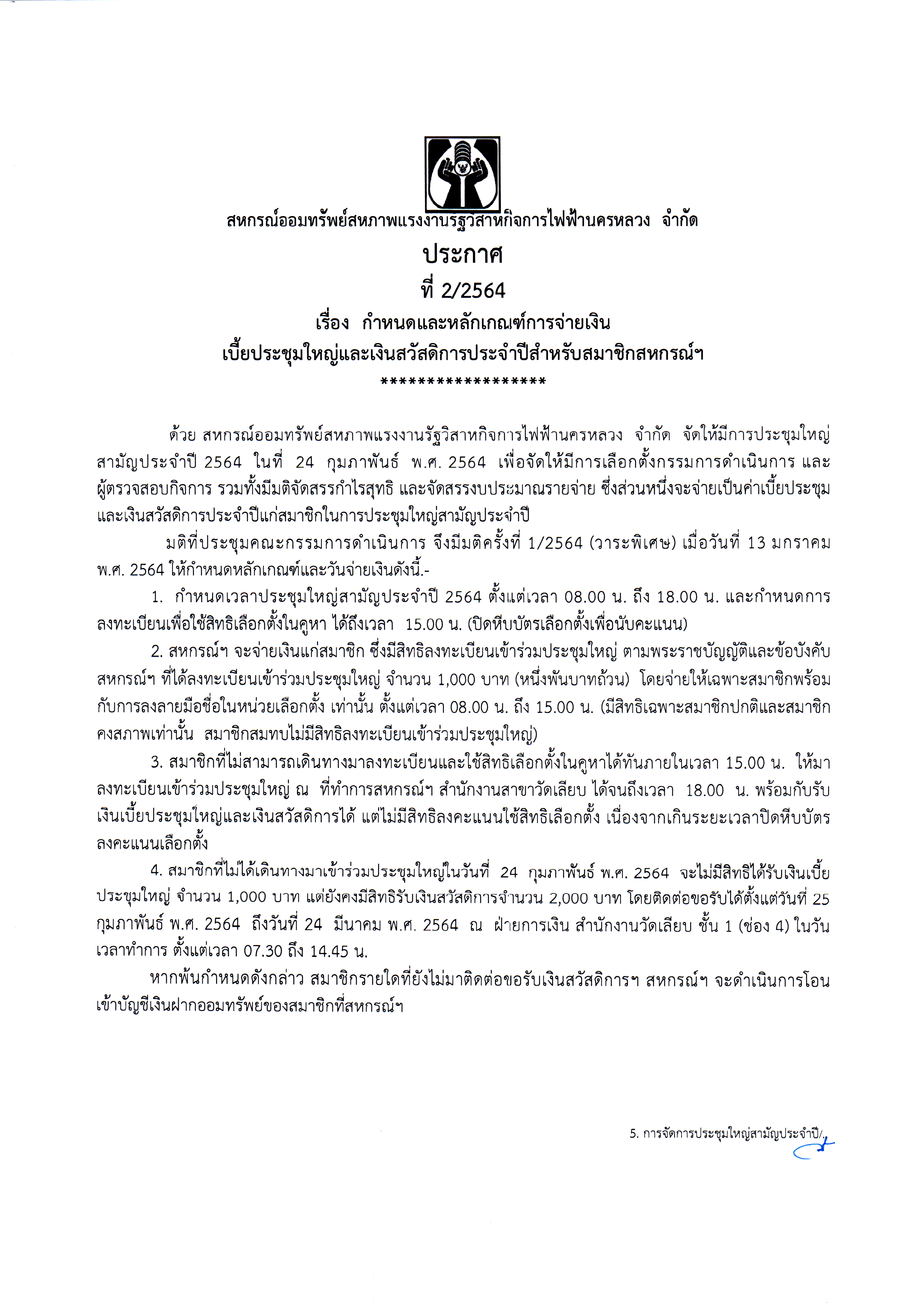 ประกาศที่ 2/2564 เรื่อง กำหนดหลักเกณฑ์การจ่ายเงินเบี้ยประชุมใหญ่และเงินสวัสดิการประจำปีสำหรับสมาชิกสหกรณ์