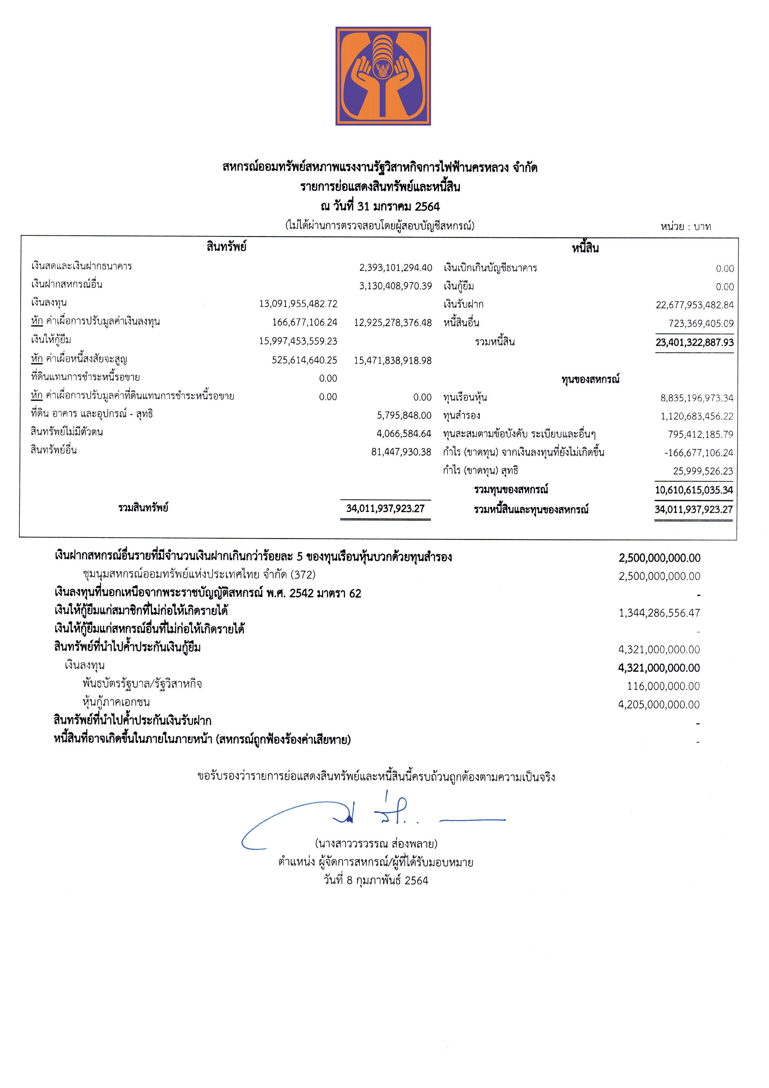 ประกาศรายการย่อแสดงทรัพย์และหนี้สิน ณ วันที่ 31 มกราคม 2564