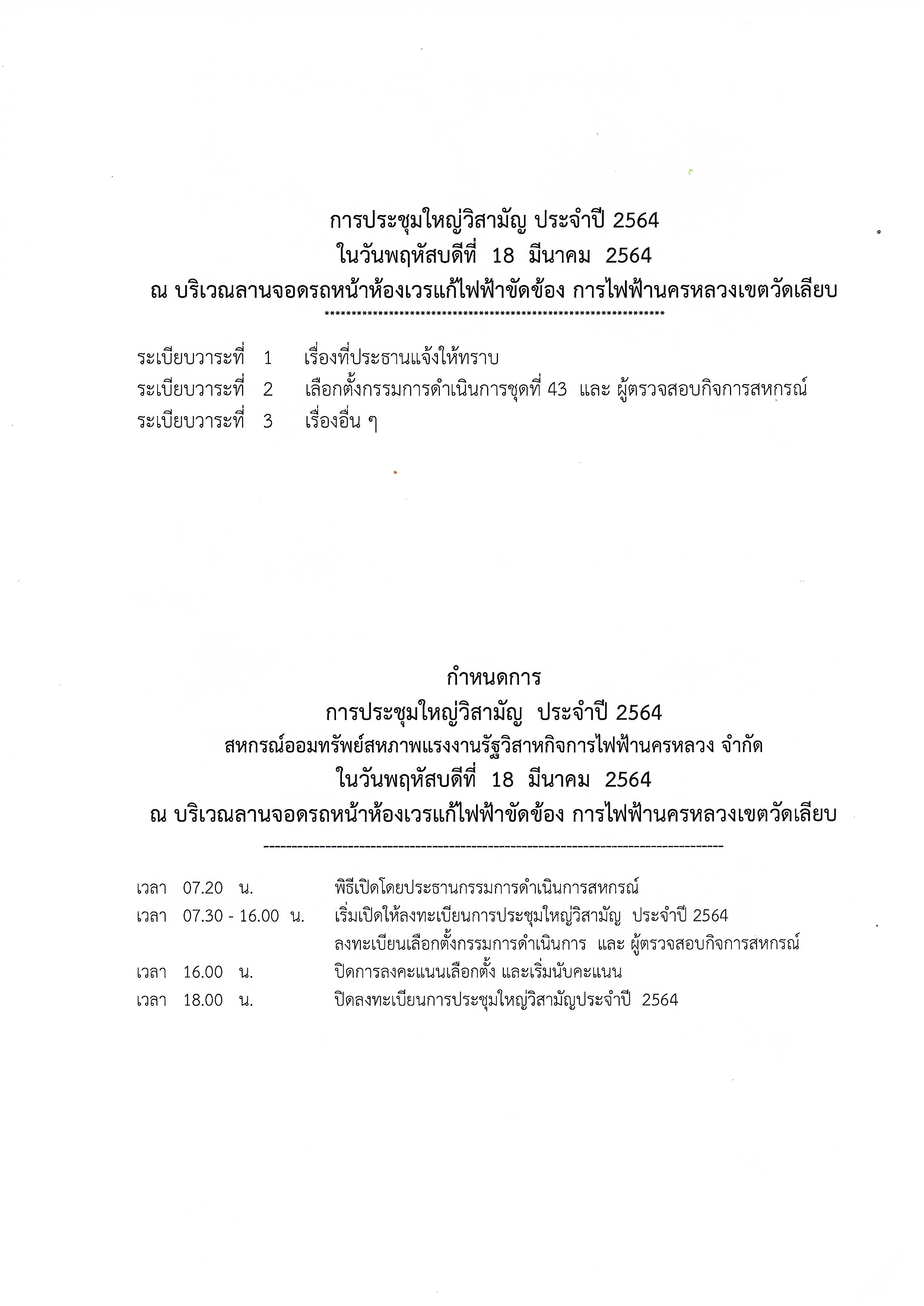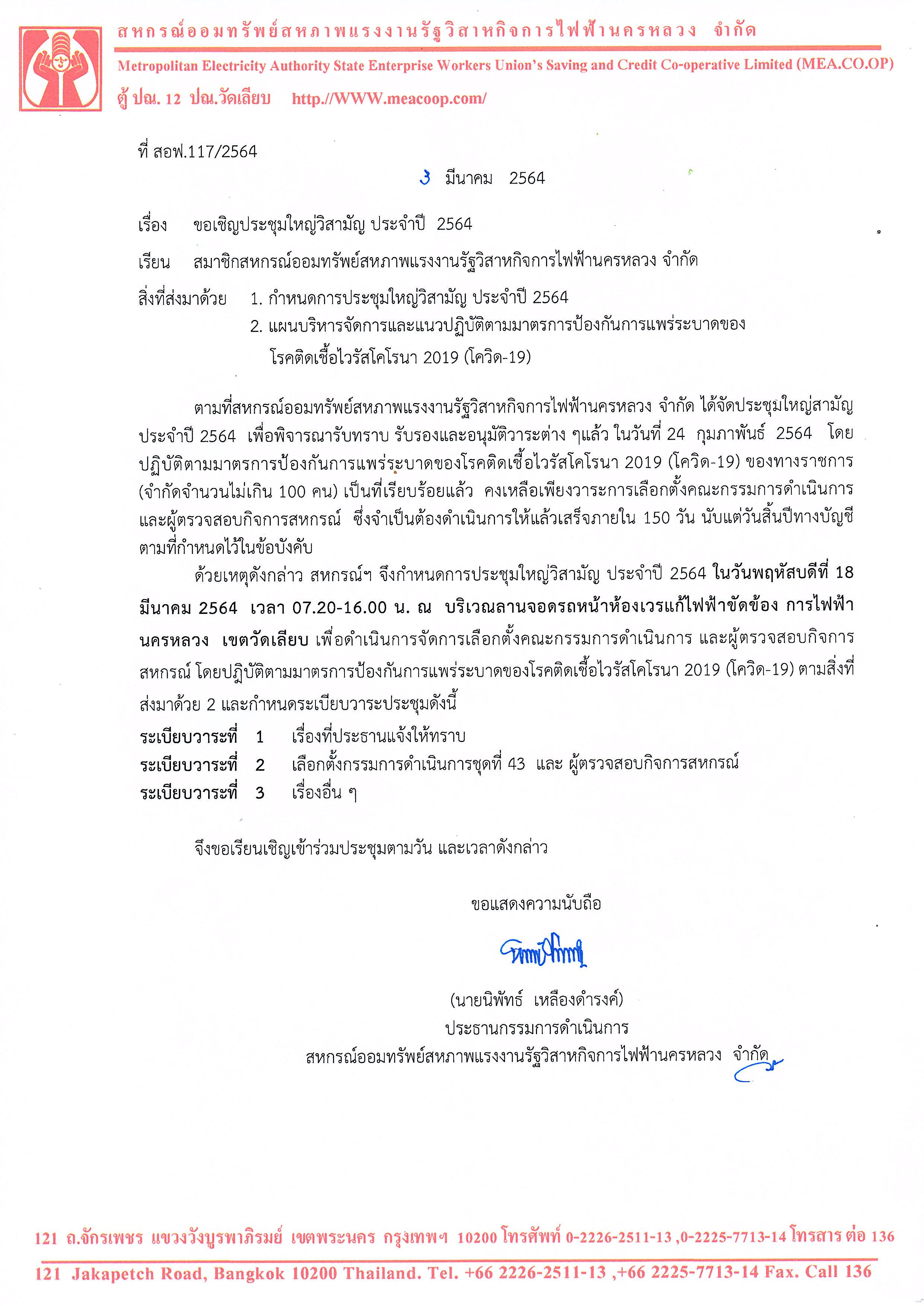 • ขอเชิญประชุมใหญ่วิสามัญ ประจำปี 2564