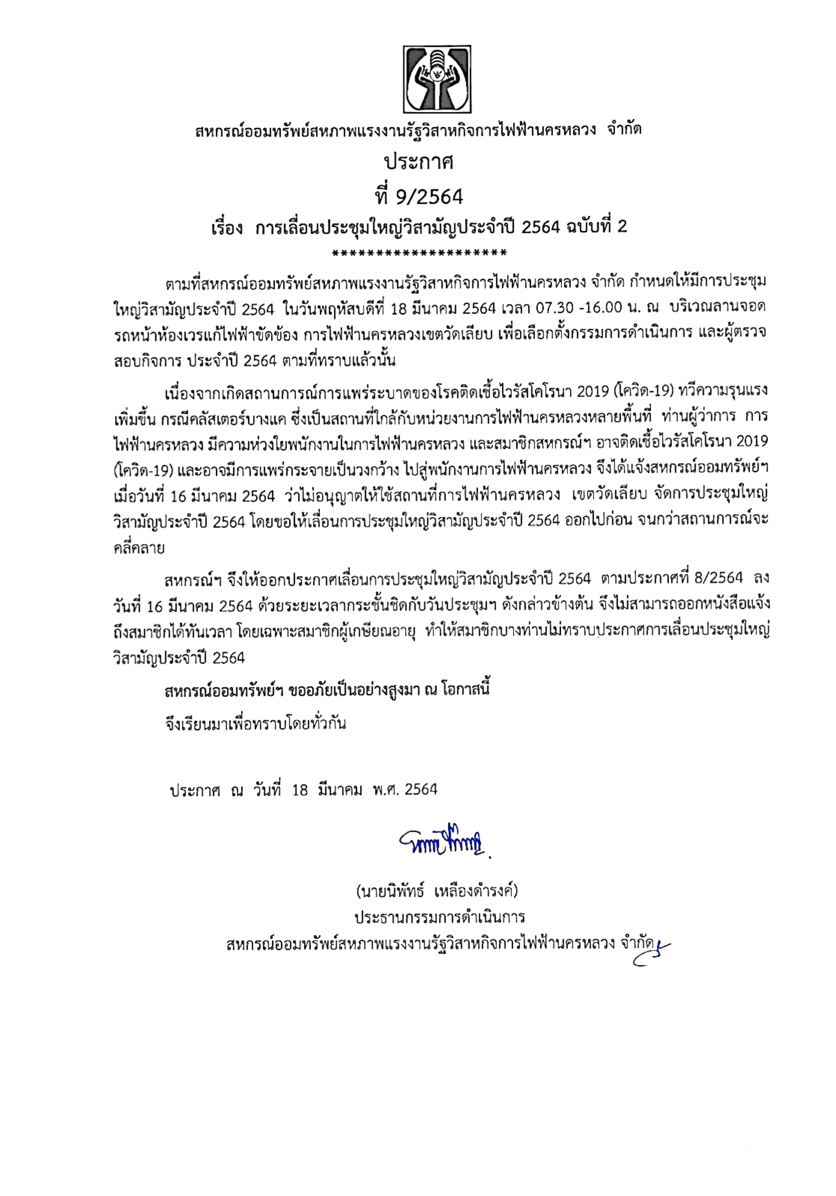 ประกาศที่ 9/2564 เรื่อง การเลื่อนประชุมใหญ่วิสามัญ ฉบับที่ 2