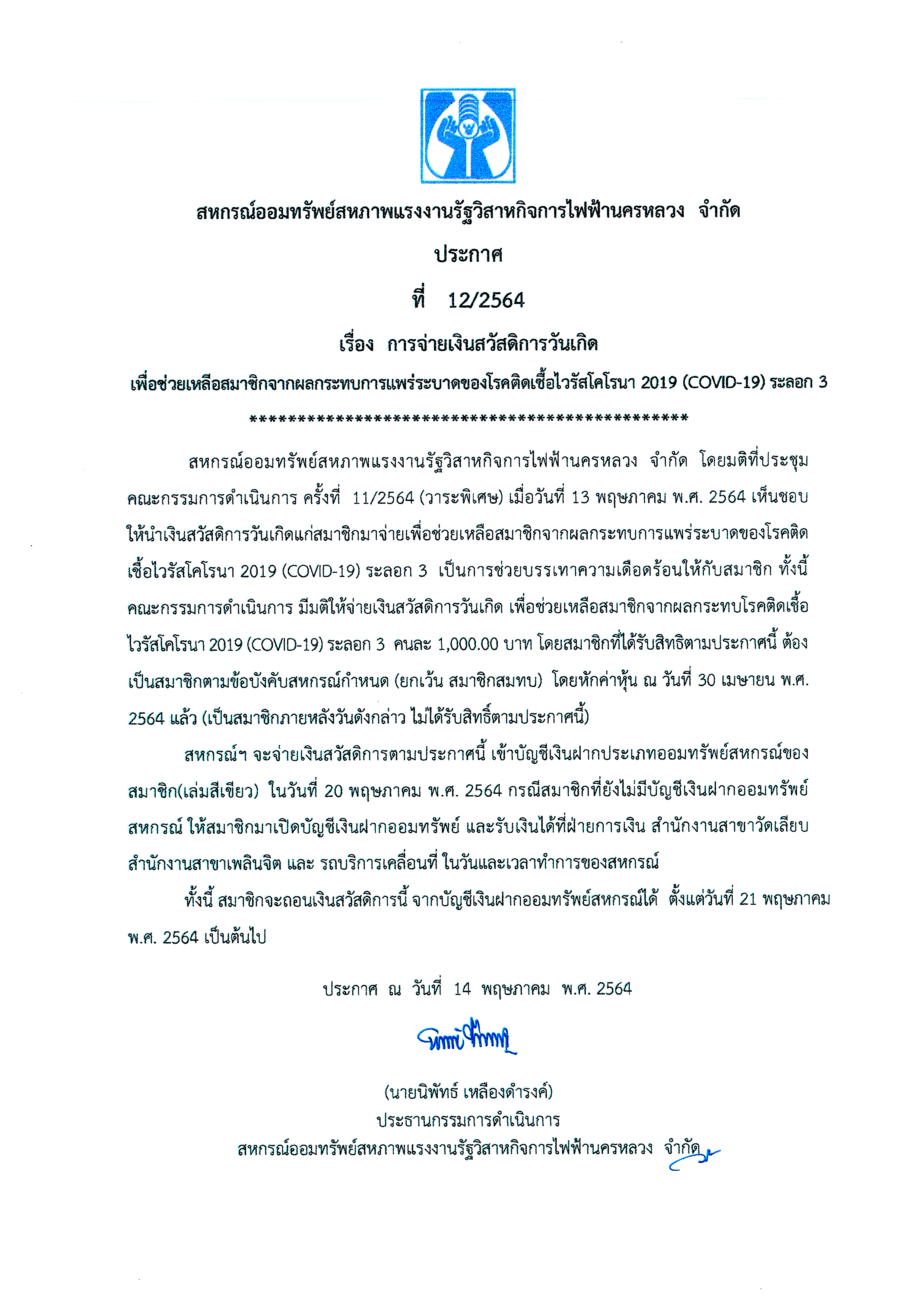 • ประกาศที่ 12/2564 เรื่อง การจ่ายเงินสวัสดิการวันเกิด