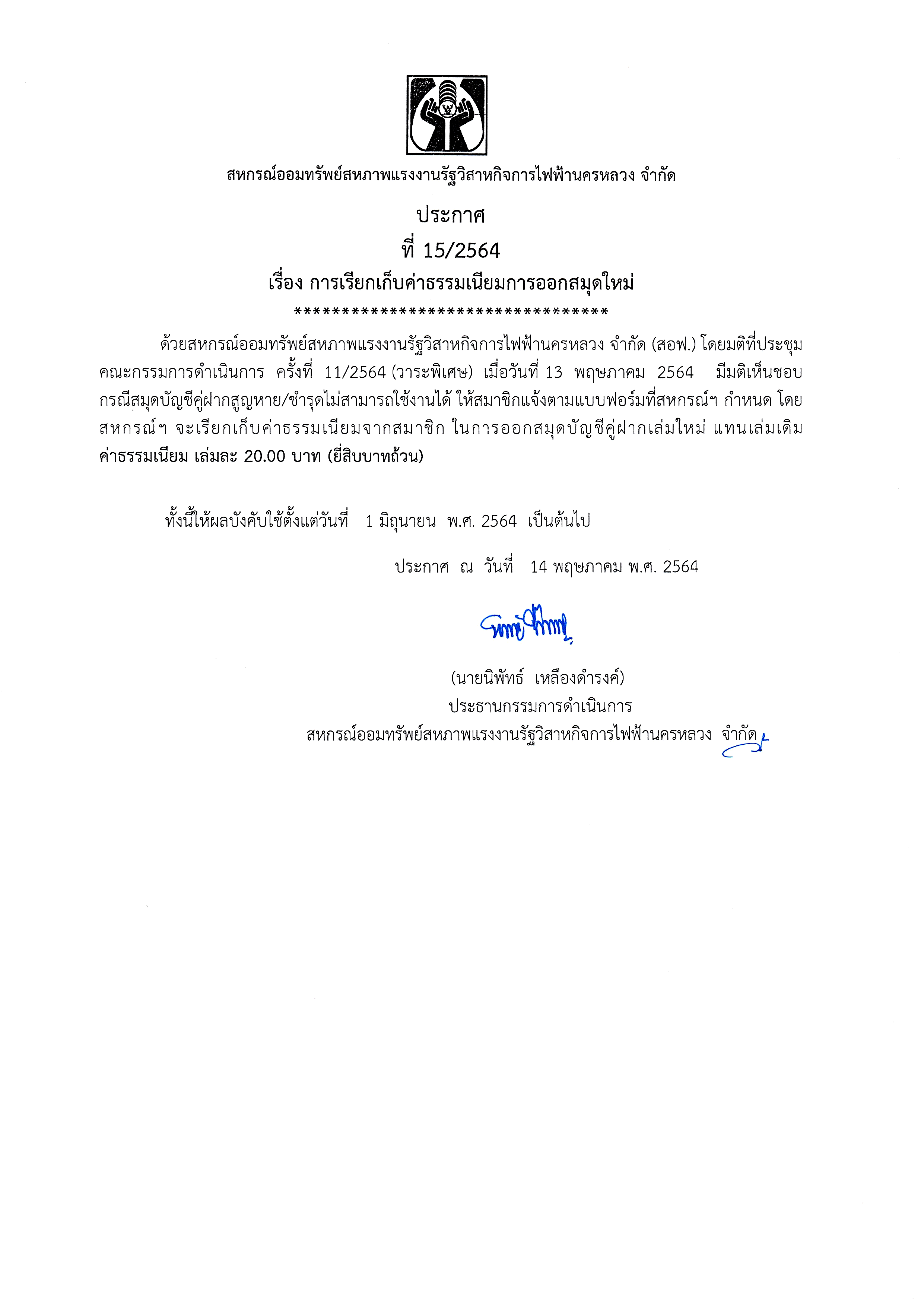 • ประกาศที่ 15/2564 เรื่อง การเก็บค่าธรรมเนียมการออกสมุดใหม่