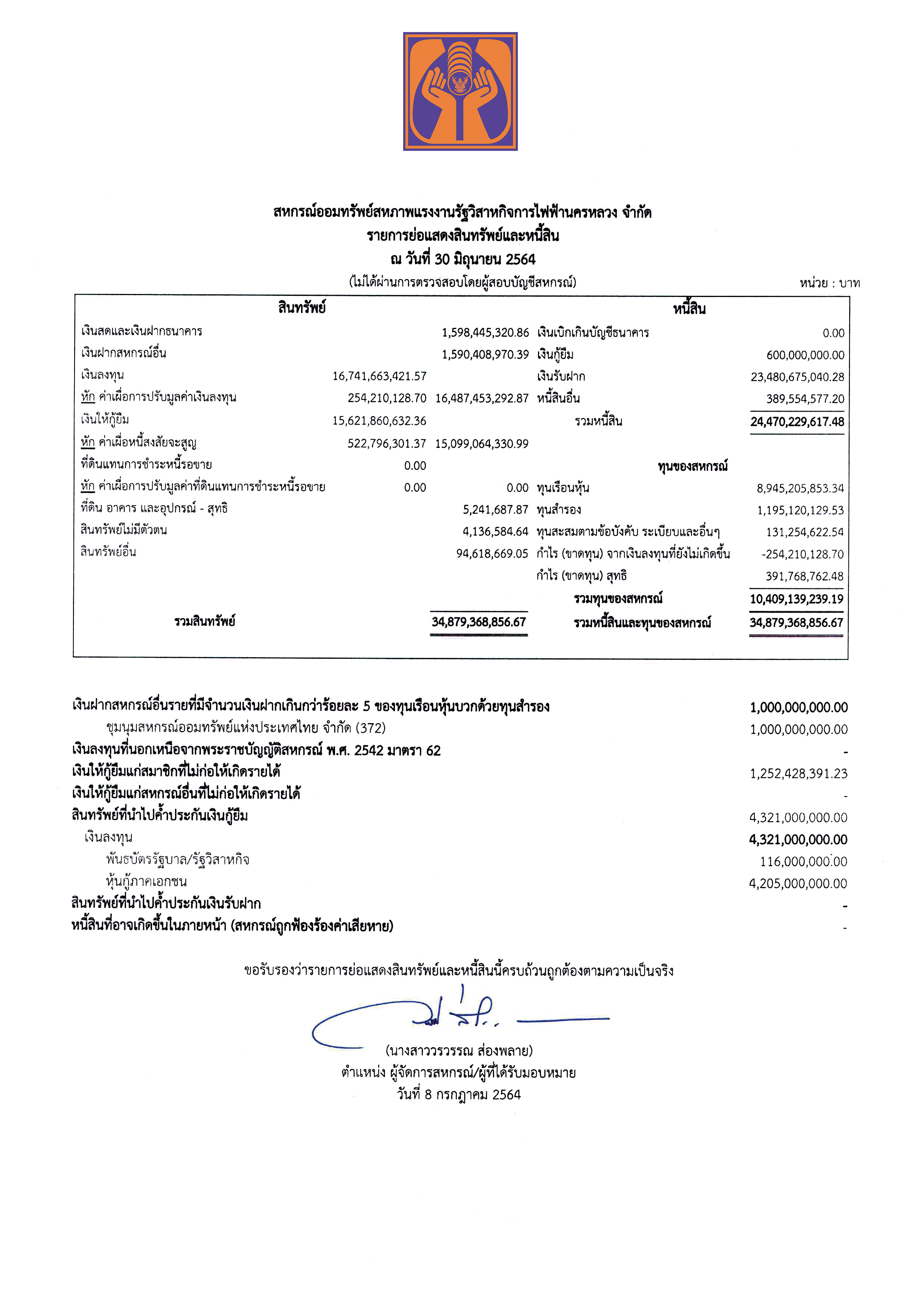 ประกาศรายการย่อแสดงสินทรัพย์และหนี้สิน ณ วันที่ 30 มิถุนายน 2564