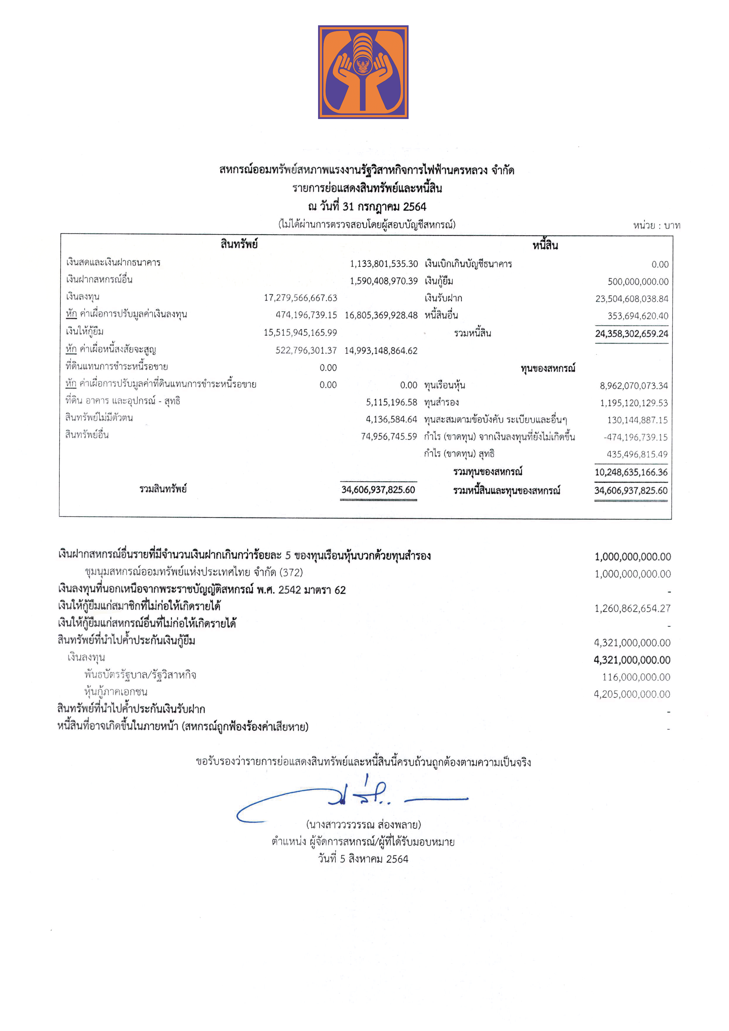 ประกาศรายการย่อแสดงสินทรัพย์และหนี้สิน ณ วันที่ 31 กรกฎาคม 2564