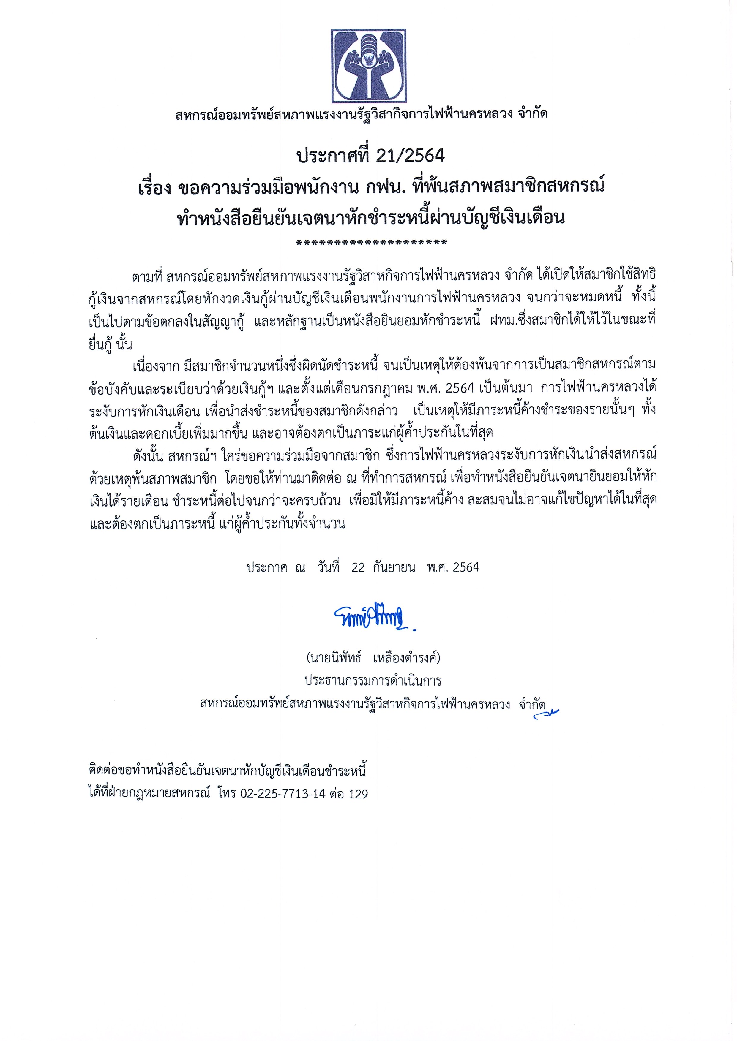 • ประกาศที่ 21/2564 เรื่อง ขอความร่วมมือพนักงาน กฟน. ที่พ้นสภาพสมาชิกสหกรณ์ทำหนังสือยืนยันเจตนาหักชำระหนี้ผ่านบัญชีเงินเดือน