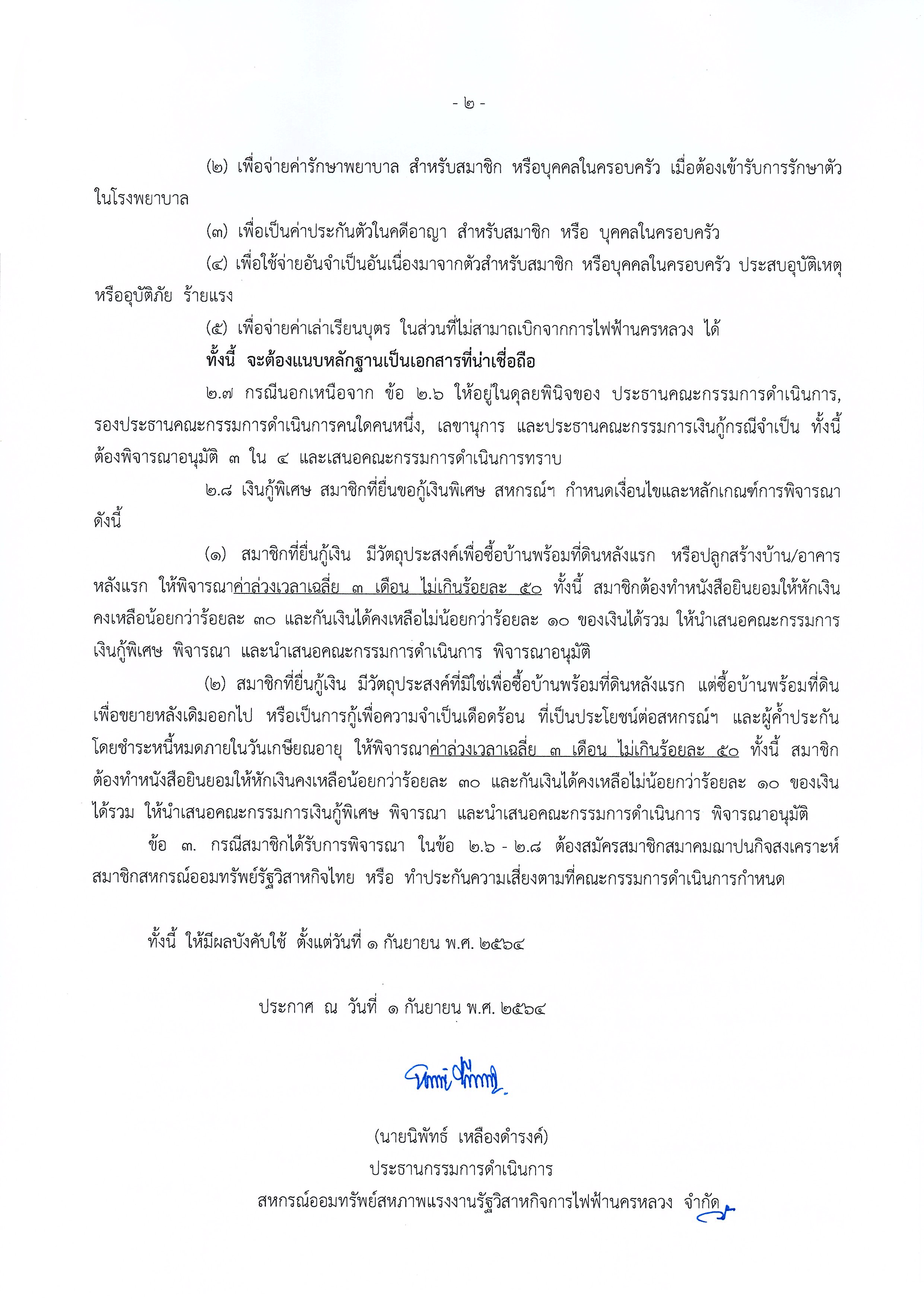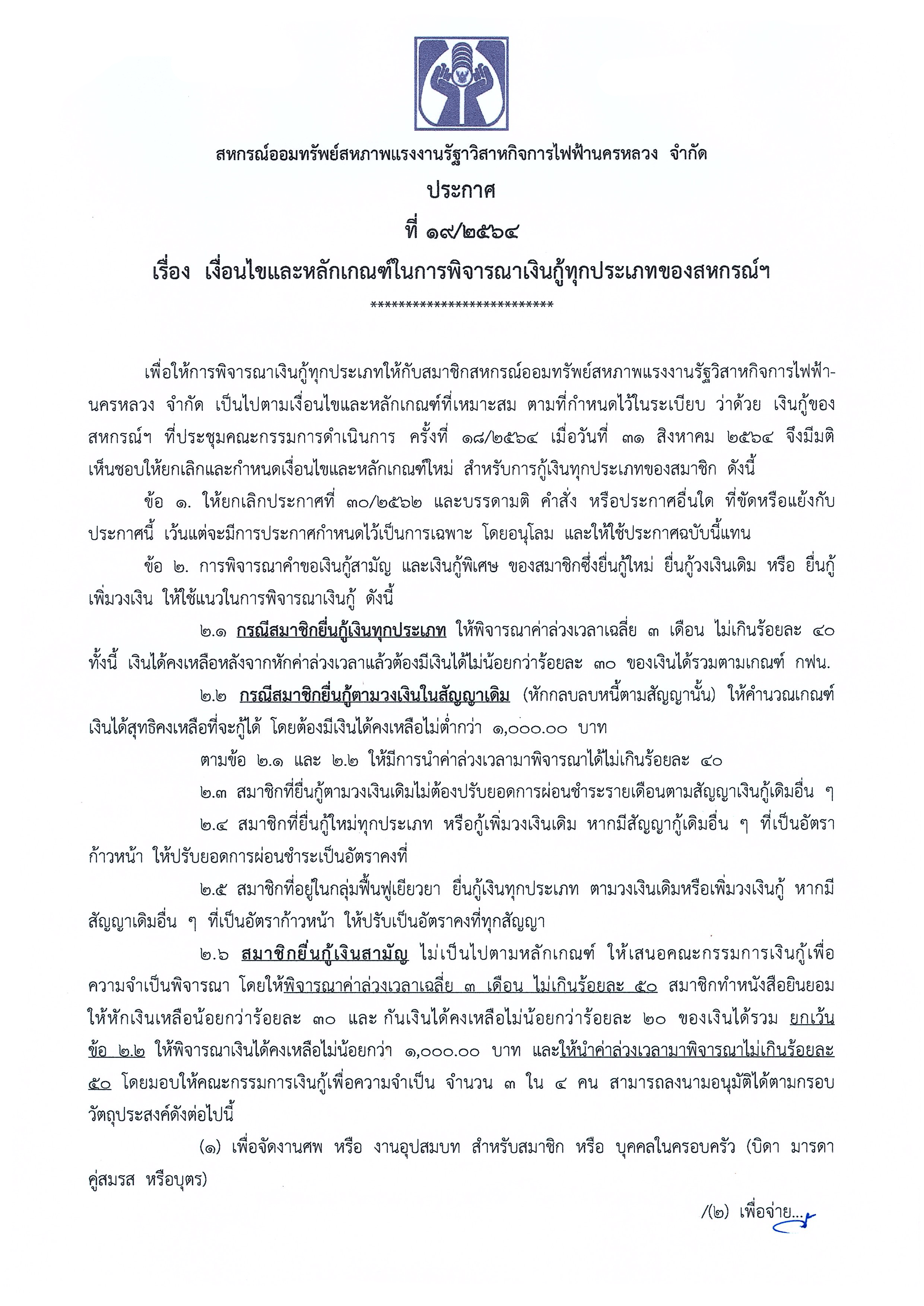 • ประกาศที่ 19/2564 เรื่อง เงื่อนไขและหลักเกณฑ์ในการพิจารณาเงินกู้ทุกประเภทของสหกรณ์ฯ