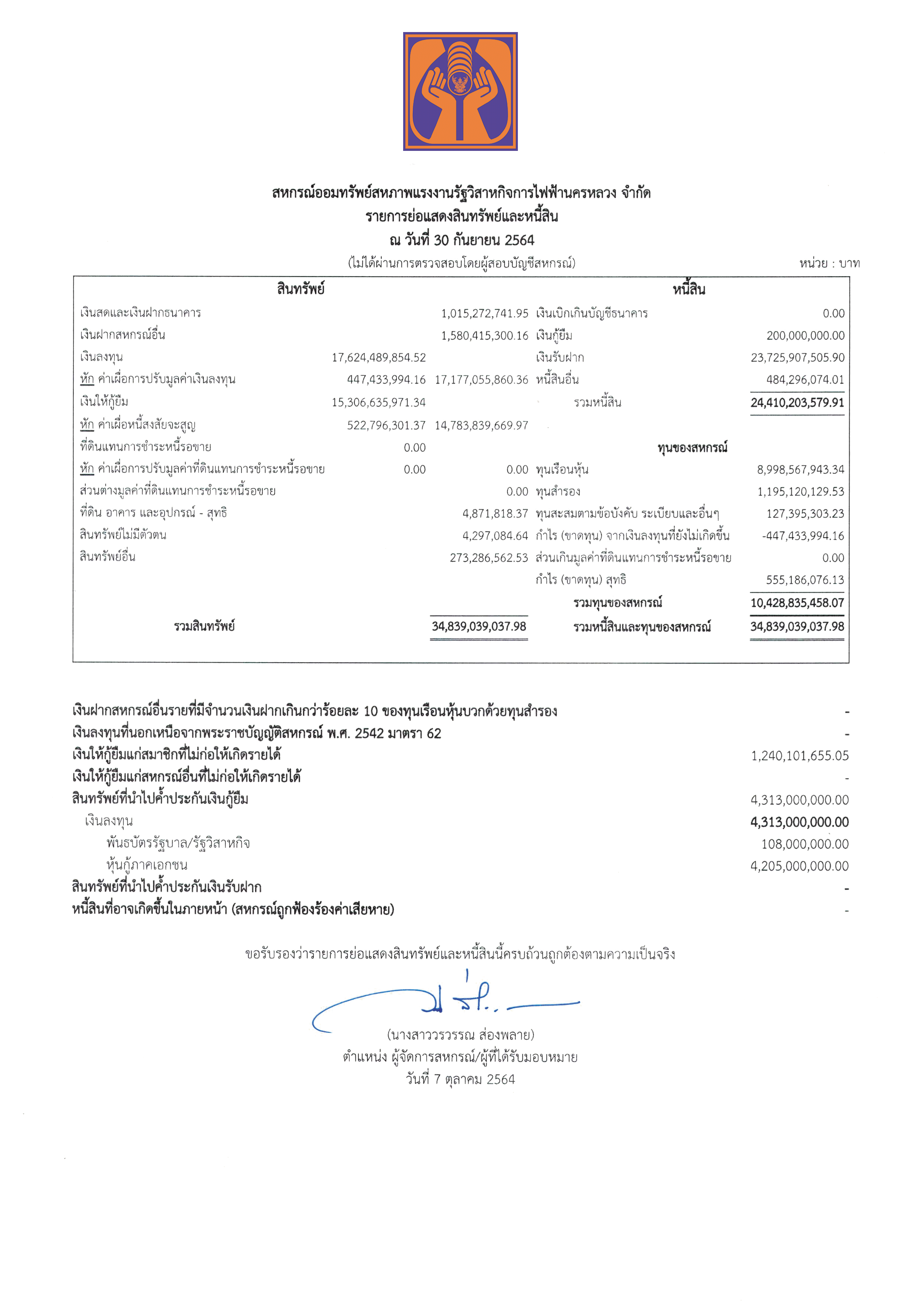 ประกาศรายการย่อแสดงสินทรัพย์และหนี้สิน ณ วันที่ 30 กันยายน 2564