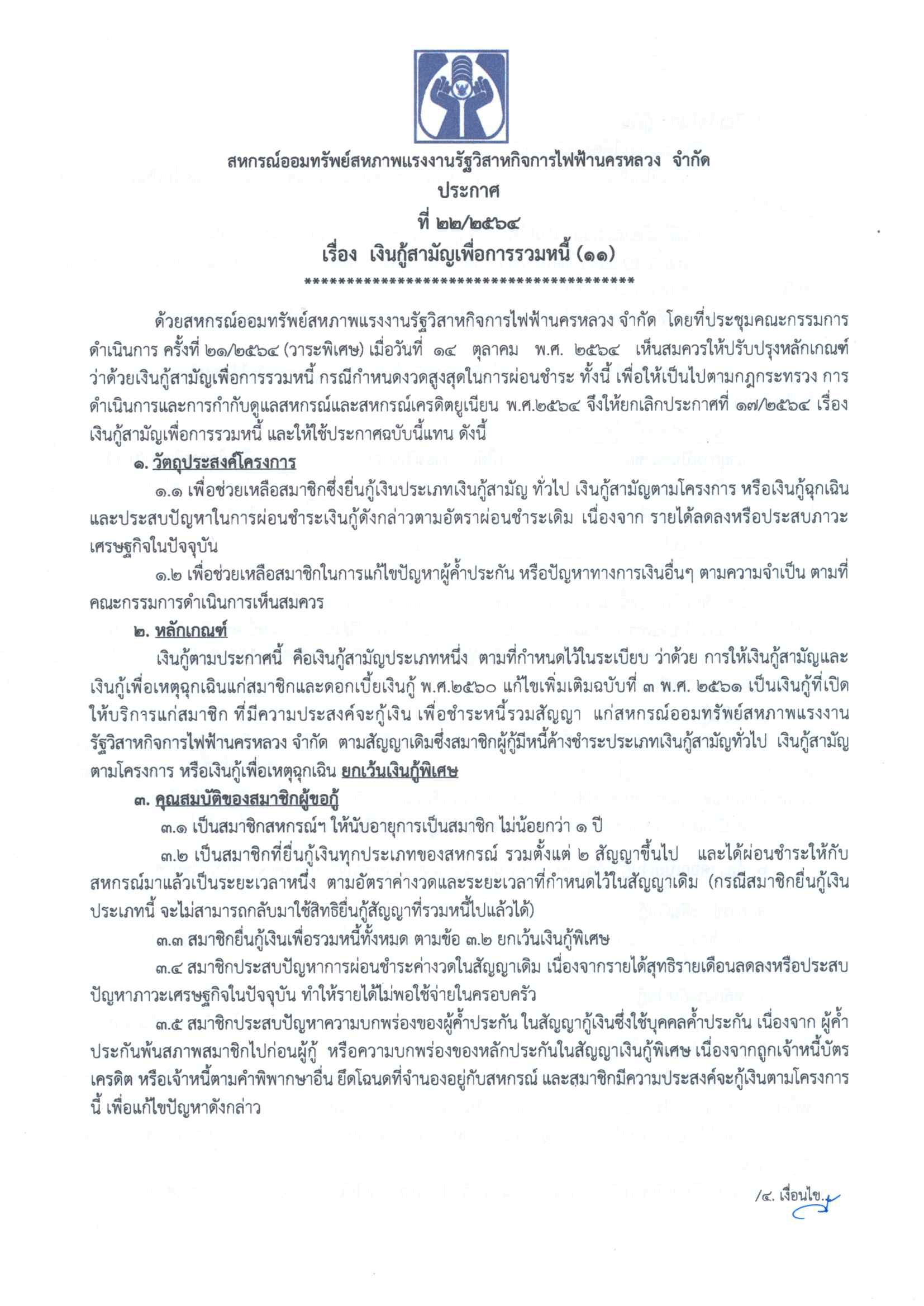 • ประกาศที่ 22/2564 เรื่อง เงินกู้สามัญเพื่อการรวมหนี้ (๑๑)
