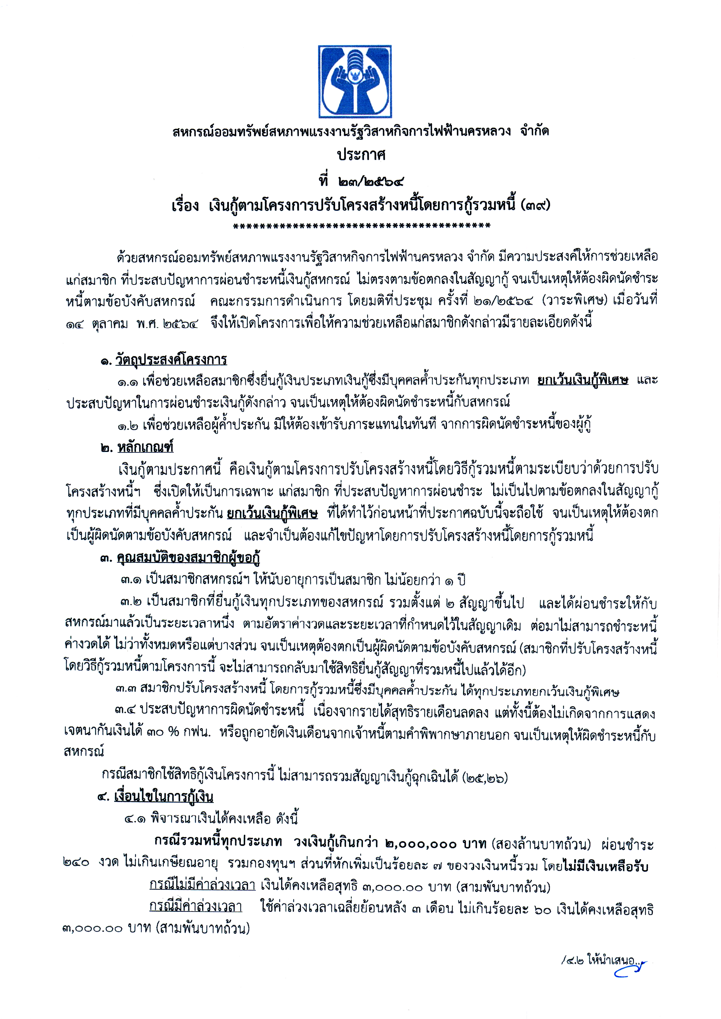 • ประกาศที่ 23/2564 เรื่อง เงินกู้ตามโครงการปรับโครงสร้างหนี้โดยการกู้รวมหนี้ (๓๙)