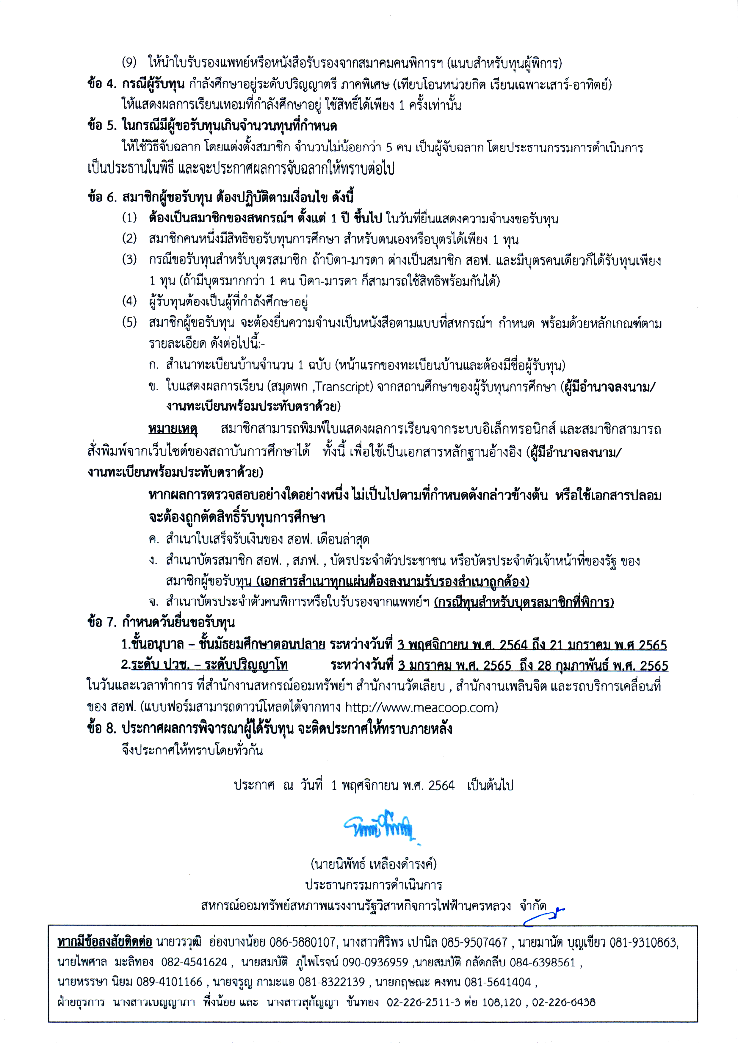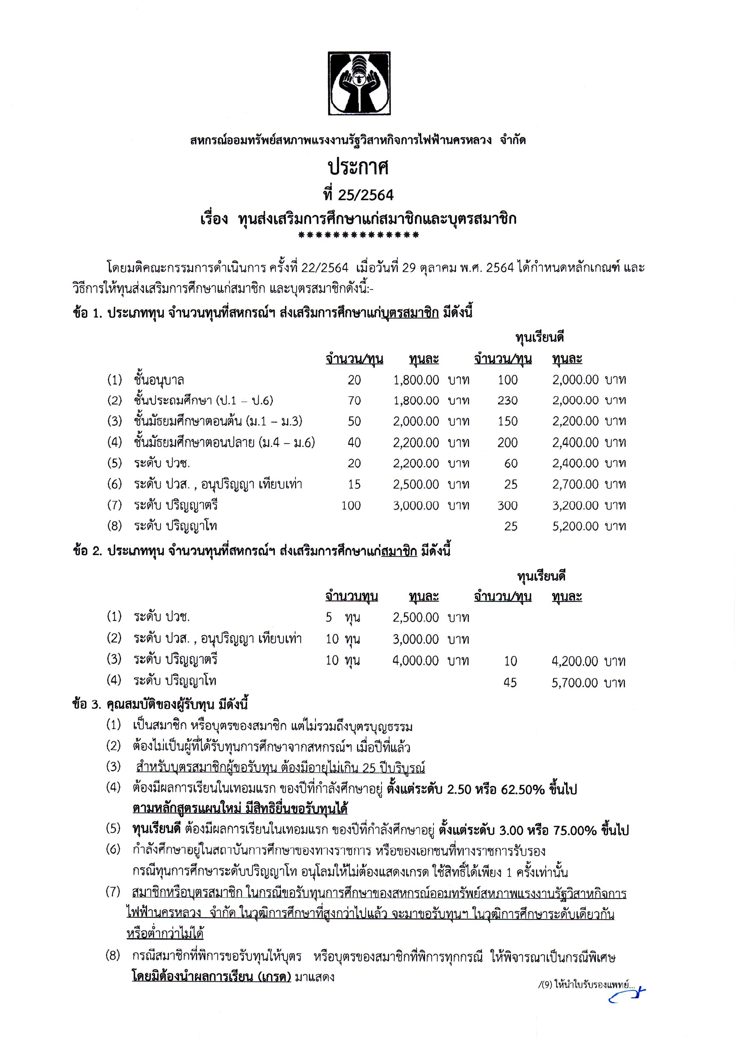 • ประกาศที่ 25/2564 เรื่อง ทุนส่งเสริมการศึกษาแก่สมาชิกและบุตรสมาชิก