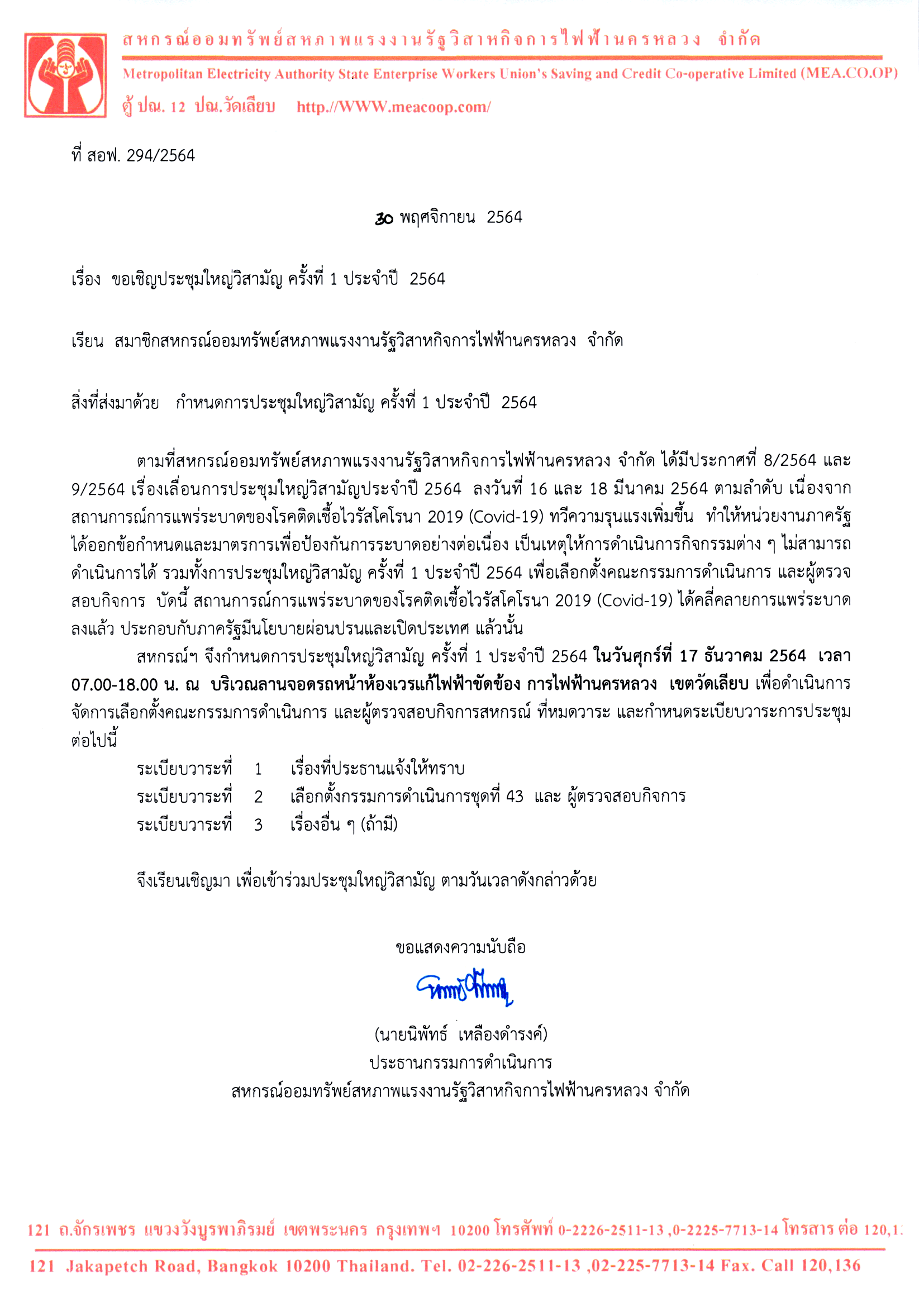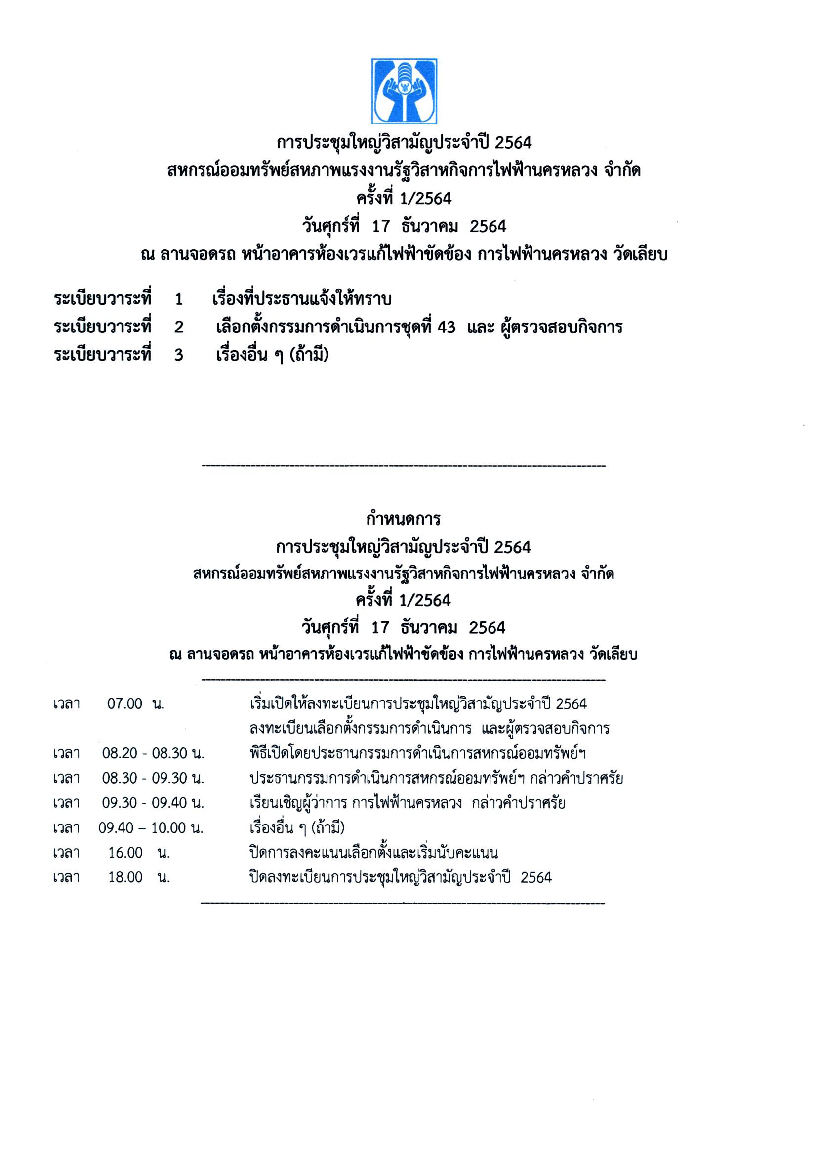 ขอเชิญประชุมใหญ่วิสามัญ ครั้งที่ 1 ประจำปี 2564