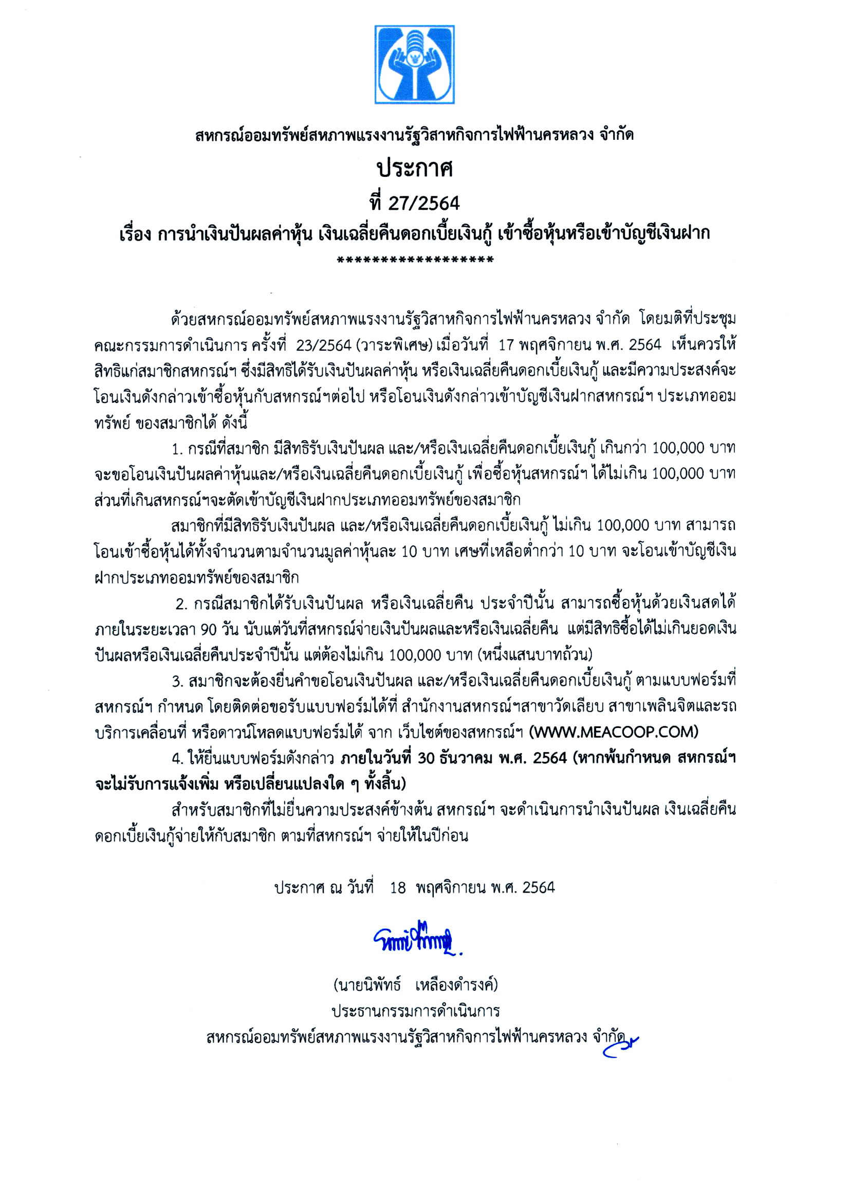 • ประกาศที่ 27/2564 เรื่อง การนำเงินปันผลค่าหุ้น เงินเฉลี่ยคืนดอกเบี้ยเงินกู้ เข้าซื้อหุ้นหรือเข้าบัญชีเงินฝาก
