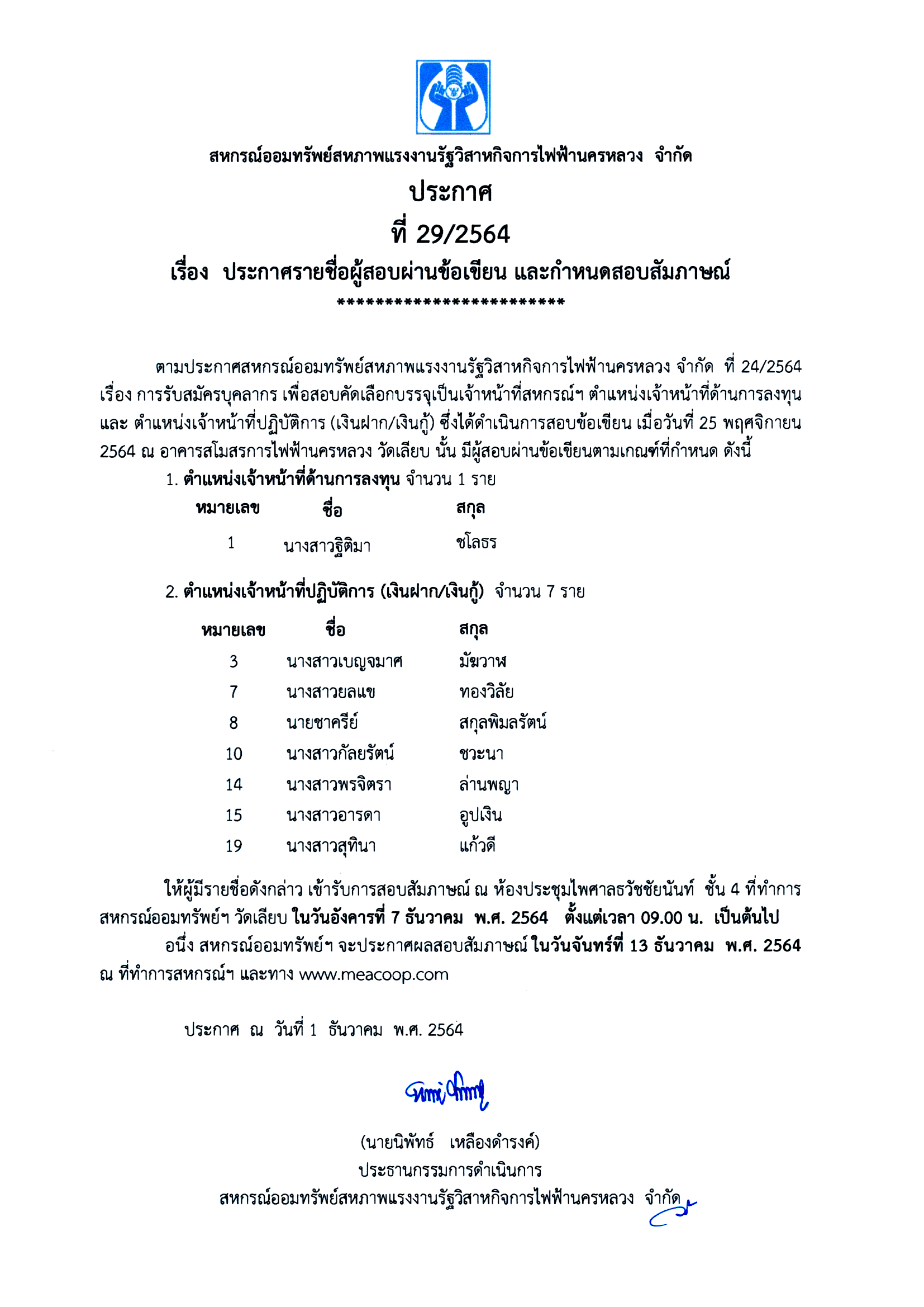 • ประกาศที่ 29/2564 เรื่อง ประกาศรายชื่อผู้สอบผ่านข้อเขียน และกำหนดสอบสัมภาษณ์