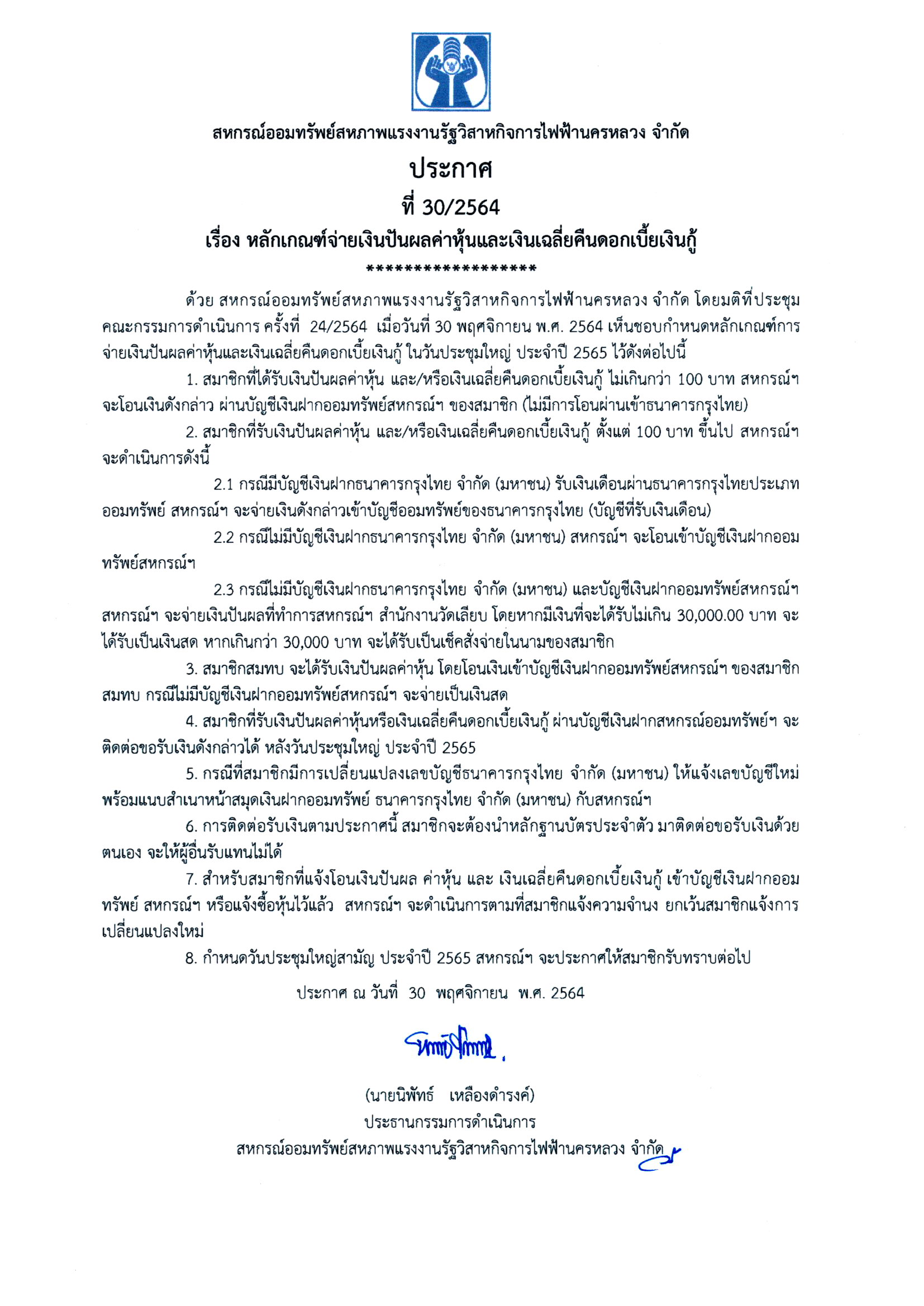 • ประกาศที่ 30/2564 เรื่อง หลักเกณฑ์จ่ายเงินปันผลค่าหุ้นและเงินเฉลี่ยคืนดอกเบี้ยเงินกู้