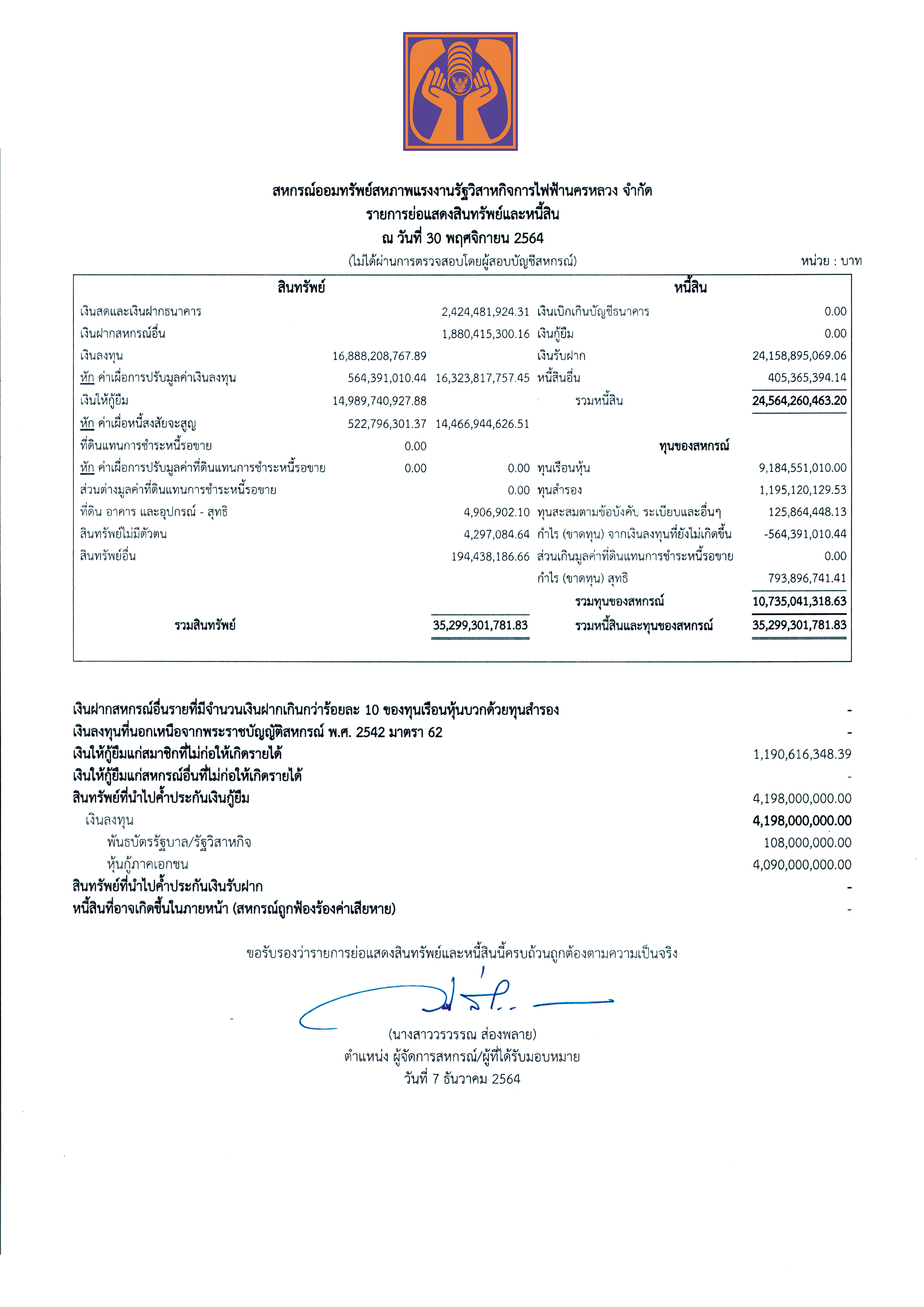 • ประกาศรายการย่อแสดงสินทรัพย์และหนี้สิน ณ วันที่ 30 พฤศจิกายน 2564