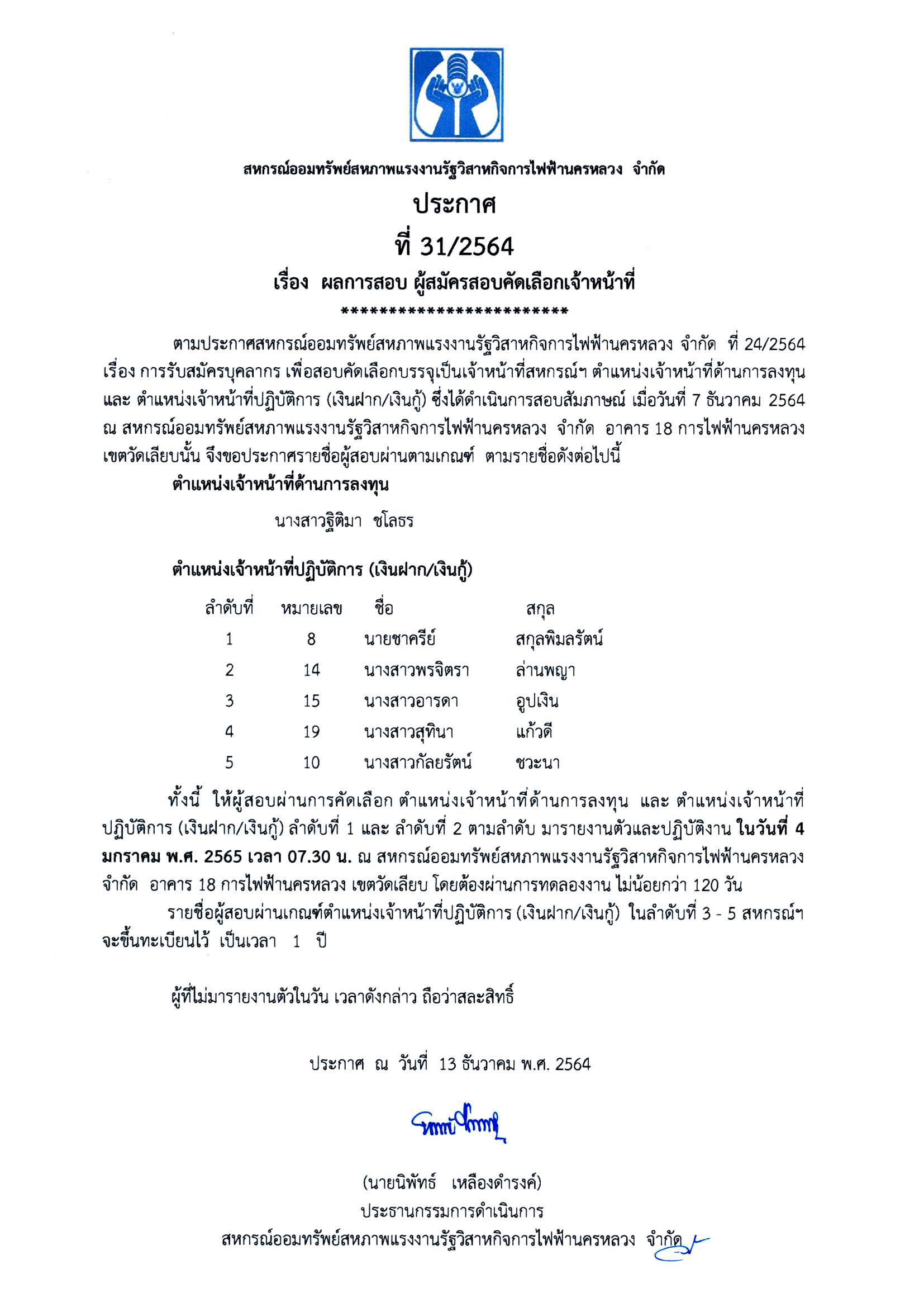 • ประกาศที่ 31/2564 เรื่อง ผลการสอบ ผู้สมัครสอบคัดเลือกเจ้าหน้าที่